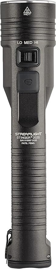 78104 Stinger 2020 2000-Lumen Rechargeable Professional Flashlight with 12V DC 1 Holder Charger, Black Special Feature Adjustable Light Modes, Weatherproof, Non Slip Grip, Impact Resistant, Rechargeable Color Black Power Source Battery Powered Light Source Type LED Material Aluminum About this item High, medium and low modes plus strobe: High: 2,000 lumens; 315m beam; runs 2 hours, Medium: 850 lumens; 200m beam; runs 4 hours, Low: 100 lumens; 70m beam; runs 24 hours, Strobe: runs 3.25 hours Intuitive switch for easy mode selection, "Set and forget it" no need to cycle through the settings to get to the desired mode Features independently functioning head and tail switches Aluminum alloy body with ergonomic anti-roll body design and textured grip Corrosion-resistant and gasket-sealed BOROFLOAT glass lens; IPX7-rated waterproof operation to 1 meter submersion; not a dive light or for underwater use; 2-Meter impact resistance tested