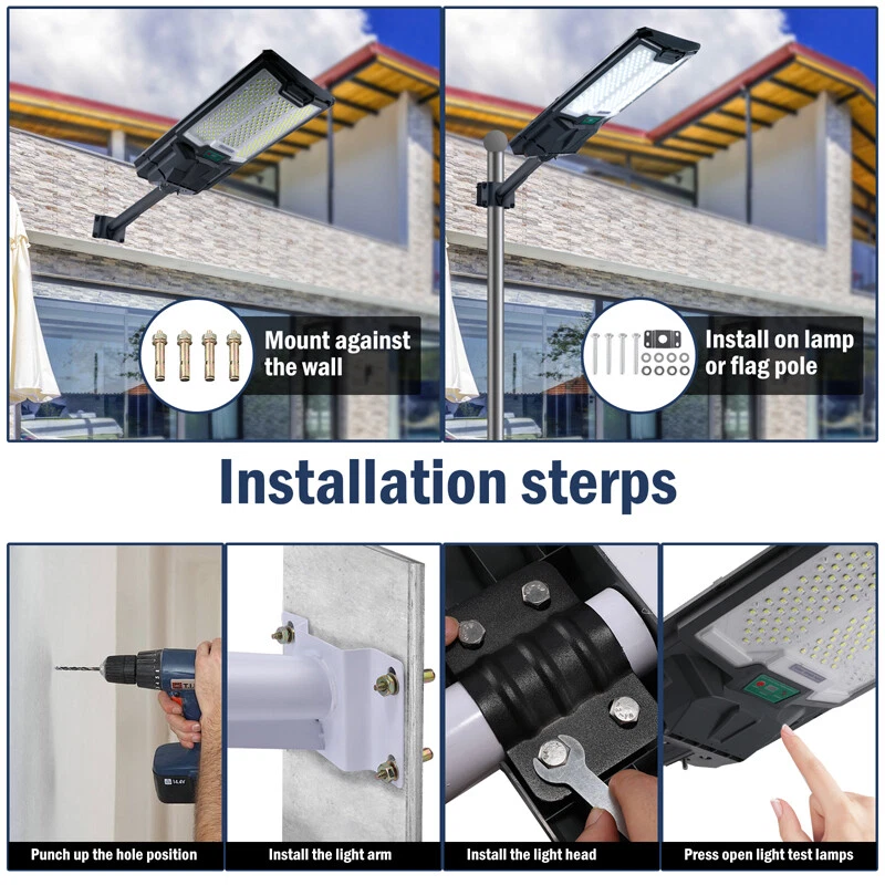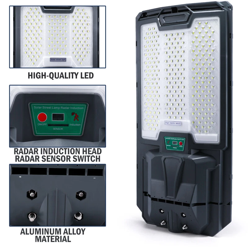 2000W Commercial LED Solar Street Lights Outdoor Dusk to Dawn Solar Super Bright Feature: -- IP65 Waterproof: Made of durable ABS and PC material, this street light has IP65 waterproof performance and can withstand rain, snow, high temperature and other extreme weather conditions. -- High-brightness Lighting: The street lamp has 238 5050 high-brightness SMD lamp beads, with a lighting area of 800 square meters, which can bring super brightness to places around the home, Such as outdoor walls of squares, parks, gardens, courtyards, streets, paths, etc. it is also equipped with efficient solar panels that can convert light energy into electricity. -- 3 Intelligent Modes: Light control + radar movement + remote control, intelligent light control system, automatic charging during the day, automatic light turning on at night, intelligent human body radar induction, light up when people come, turn off when people leave, large sensing range, long charging time 6-8 hours, 20 hours of full power lighting. Specification: Shell color: gray Light color: white Material: ABS+PC Wattage: 2000W LED quantity:139-238pcs Waterproof level:IP65 Light area:500-800㎡ Charging time:6-8H Fully charged lighting: 20 hours Type of bulb: LED(5054SMD) Lamp beads: 238 5050 high brightness SMD lamp beads Mode:light control+radar motion+remote control Installation height: 3-5m/9.8-16ft Solar panel: 6V/28W polycrystalline high energy efficiency solar panel Battery capacity: 32650 lithium iron phosphate battery 3.2V 25Ah Lamp body size: 713*342*82mm/28*13.5*3.2inch Package includes: 1*Street Light 1*Remote Control 1*Instruction Manual 1*Packing Box
