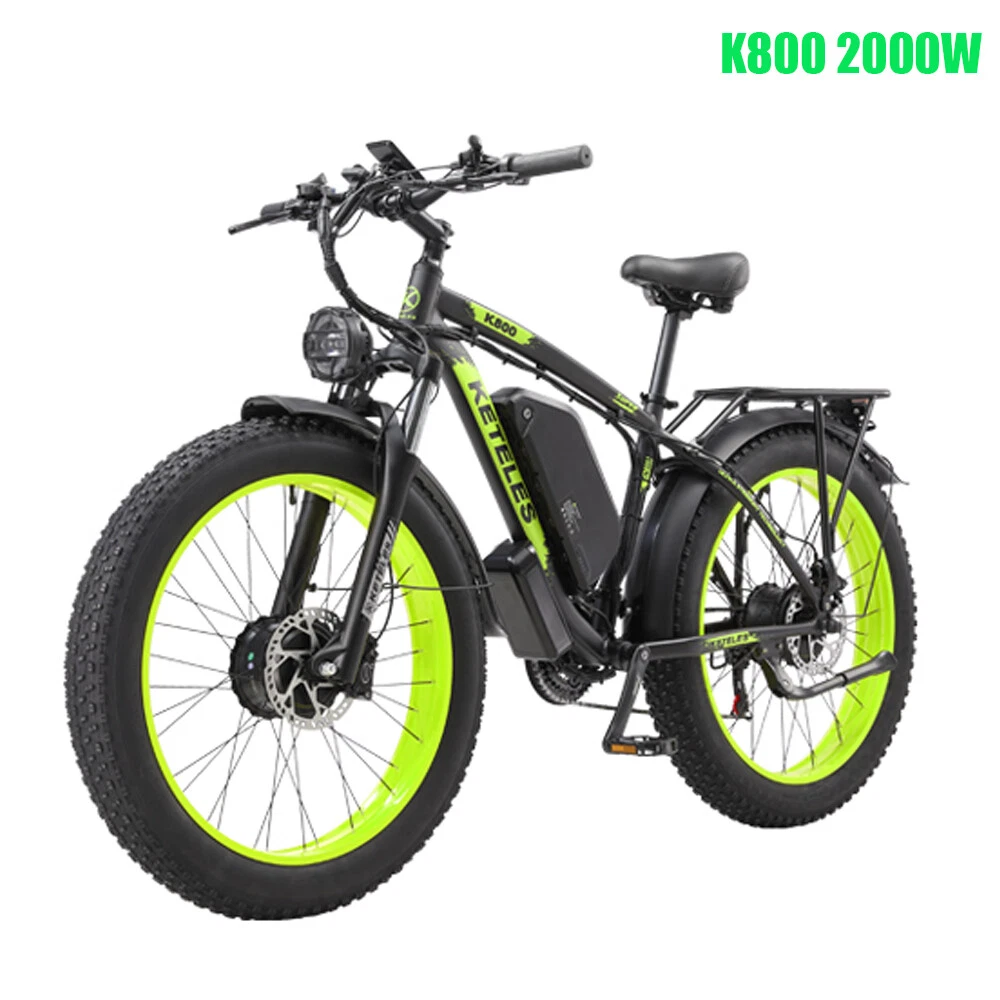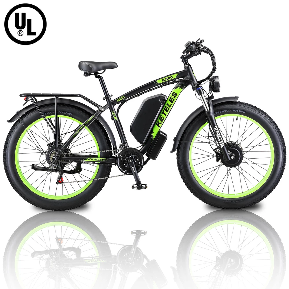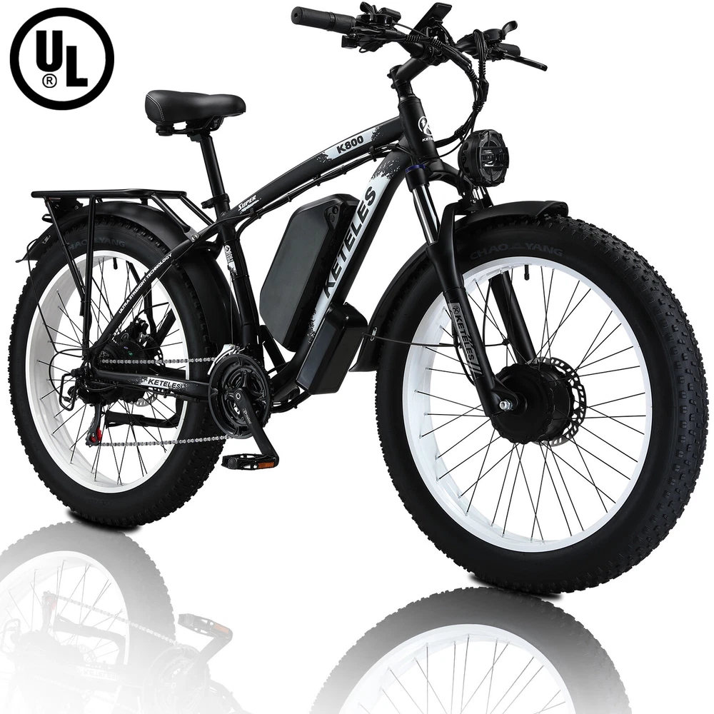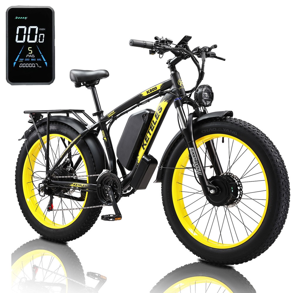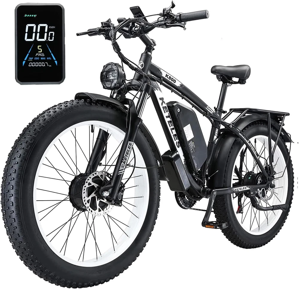 2000W Dual Motor Electric Bike 26" Fat Tire E-Bicycle 48V/23Ah for Adult KETELES Note: Our products have been certified under UL2849 safety standards. About this item: *Powerful Motor E-bike: The K800 is a powerful all-wheel drive electric bike for adults. 2000W brushless motor (1000W front and rear) with Shimano 21-speed gear for an easy ride, with a top speed of about 35MPH , with a long range of more than 40 miles. Equipped with 48V, 23AH detachable lithium battery, so you can bring the battery to your home or office to recharge. Charging time: Approximately 5-8 hours, 2000 cycles of charging. *Fat Tires 26"x4.0" Ebike: Fat Tire and front suspension to ride smoothly on any terrain, including rocky roads, sandy beaches, snowy suburbs and so on. *Hydraulic Disc Brakes: The front and rear hydraulic brake system with power-off function offers an easy brake within 2 seconds, which provide more effective braking in rainy weather, heavy off-road, long downhill, high-speed riding and adverse conditions, stop the e-bike quickly and smoothly. Equipped with 21 speed gears, more accurate and stable. The lockable aluminum suspension front fork has a good shock absorption effect, which can offer you safer and comfortable riding experience. *Smart Display: Mileage 5-speed LCD display computer shows your speed per hour, total distance and remaining battery power for a better riding experience. You can then control the display of miles or kilometers as a unit of speed or mileage through the settings menu. *4 Riding Modes: This electric bike offers a range of riding modes to suit your preferences. You can choose from pure electric mode, pedal assist mode, classic bike mode, or even activate cruise control mode for easy riding. Each mode has its own unique benefits, allowing you to enjoy a customized riding experience every time. *Easy installation: 85% of the bike is pre-installed, you only need to manually install a few simple accessories. *1 Year Warranty: We provide 1 year warranty. If you have any questions about this item please directly contact us. Warm Tips: * New electric bike passes road test before packing, therefore dust on the tires is inevitable. * Upon arrival, mark down the serial number, which locates on the middle axle tube, and register to vehicle management center. It is necessary to track your ebike while preventing loss. * Please be aware of the height of electric bike. Specification: Bike Type E-Bike Age Range Adult Brand KETELES Number of Speeds 21 Color Black-Blue / Black-Green / Black-Yellow / Black-White Wheel Size 26"x4.0" Brake Style Disc Frame 6061 Aluminum Alloy Frame Brake Hydraulic Brake with Power Cut-off Feature Fork Aluminum Alloy Suspension Fork with Lockout Throttle Twist Throttle on the Right side of Handlebar Display Smart LCD display that shows speed, battery status, pedal assist level, etc. Range Fully Electric Mode Range: around 40~60km Pedal Assist Mode Range: around 70~90km Voltage 48 Volts (DC) Model Name K800 Wattage 2000 watts Front Motor 48V 1000W Brushless Geared Hub Motor Rear Motor 48V 1000W Brushless Geared Hub Motor Item Weight 38kg Maximum Weight Recommendation 200 Kilograms Warranty 1 year Suggested Users Unisex-adult 48V 1000W*2 75N.m Powerful Motor The high-speed brushless gear hub motor is a highly efficient and advanced motor that offers several benefits for riders. It has a simple structure, low noise, low energy consumption, and excellent riding experience. Moreover, it is easy to maintain, has remarkable waterproof performance, and adapts to various weather and terrain conditions. LED Headlights Ride at night, safe and sound! Bicycle front LED light, illuminate your every step! This bicycle front light has a super strong LED lamp, which can emit dazzling light in the dark night, clearly showing your front road condition, ensuring your safety when riding at night. No need to worry about the dangers of riding at night. Electronic Tail Lights and Full Coverage Fenders The bolded rear frame can bear more weight, the full-cover fender protects the rider from being splashed by mud and water during riding, and the bright electronic tail light helps to ensure night riding safety, reminding other traffic participants to pay attention to the rider and prevent accidents. System of riding It has a complete riding assistance system, and it can switch easily among different riding modes, to handle various riding environments. Shimano 21-Speed According to the road conditions and their objectives, riders can change different gear proportions to enhance riding and climbing efficiency. The shifting is precise, the chain does not slide or drop off, suitable for all kinds of terrains, speed can be freely altered. Aluminum Suspension Fork The suspension fork resists the bumps on the road, making the journey comfortable. It sensitively absorbs and alleviates shocks, enhancing the comfort and stability of riding, making the ride smooth and precise, allowing the rider to confidently handle various terrains, reducing the interference of bumps. The powerful and lockable aluminum alloy fork has high strength, light weight, corrosion resistance, more durable and safe. Disc brake system Front and rear hydraulic disc brake system, with power-off function, quickly and smoothly stopping. 2 larger and thicker 180mm disc rotors, providing more effective braking power, more confident downhill. Payment Delivery details Terms of sales About us Contact us Payment We accept Credit Card, Debit Card and eCheck payments through Payoneer. Delivery details 1. Thank you very much for purchasing our products. 2. All the items double checked well packed bafore shipping. 3. Itme will be dispatchec within 2 business day(not includes the holiday and weekend) after your payment. 4. We usually use Fedex or UPs logistics to transport your package, and the delivery time would be about 5-7 business days. 5. When you have completed your payment, please leave your correct phone number and address