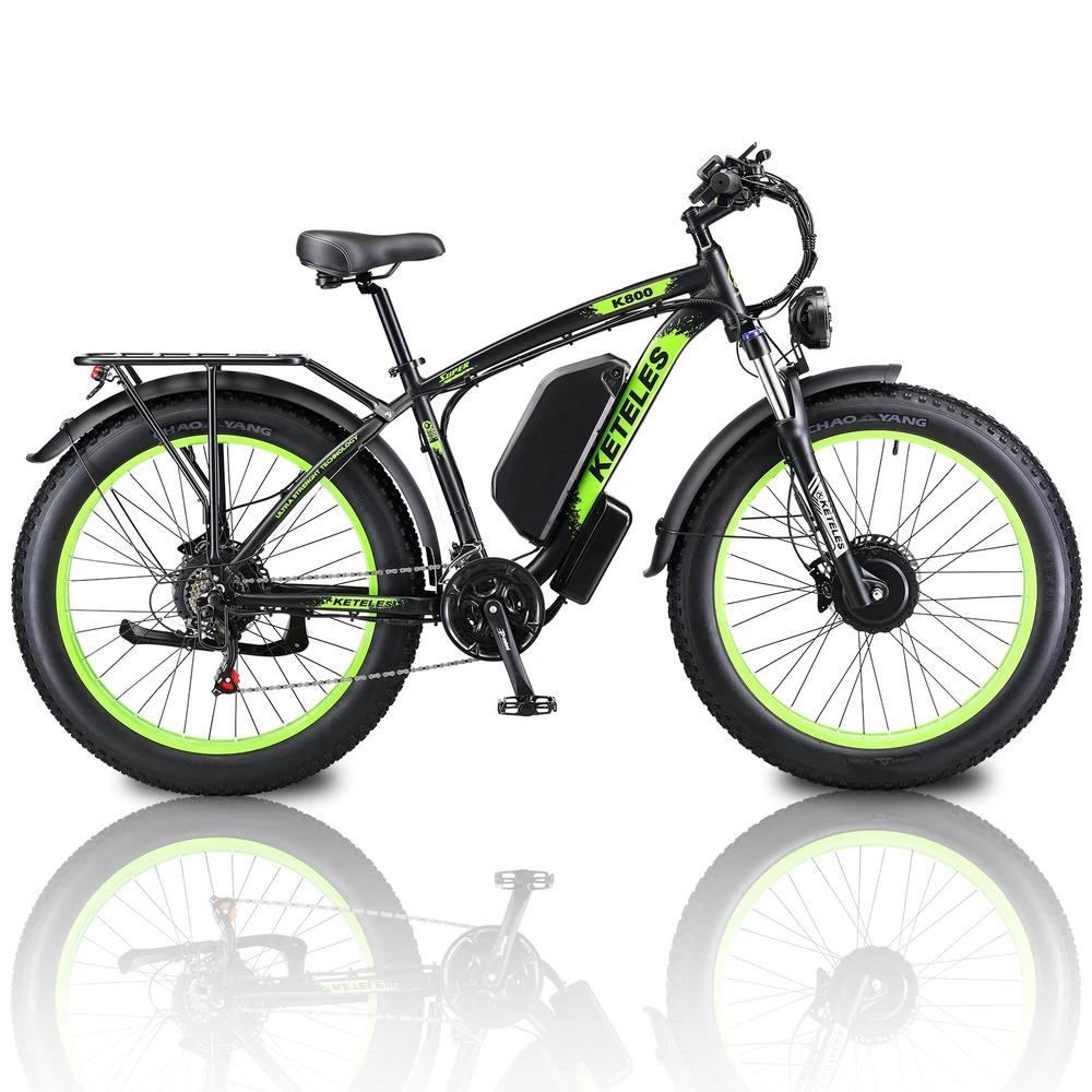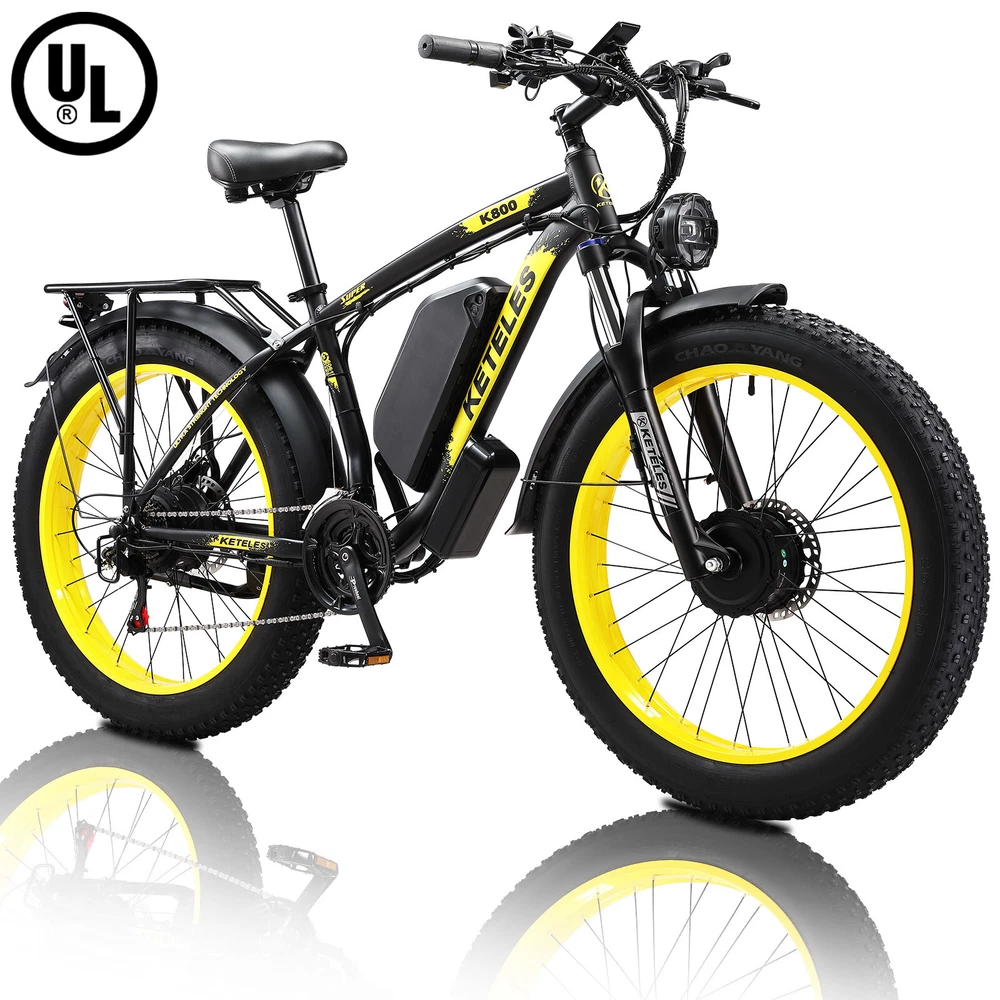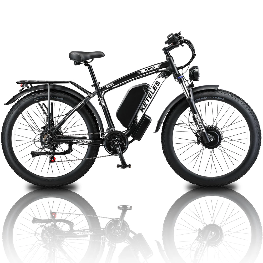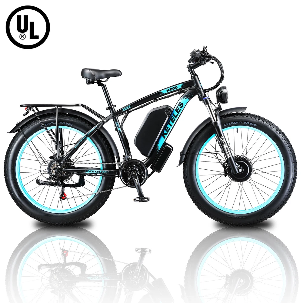 2000W Dual Motor Electric Bike 26" Fat Tire E-Bicycle 48V/23Ah for Adult KETELES Note: Our products have been certified under UL2849 safety standards. About this item: *Powerful Motor E-bike: The K800 is a powerful all-wheel drive electric bike for adults. 2000W brushless motor (1000W front and rear) with Shimano 21-speed gear for an easy ride, with a top speed of about 35MPH , with a long range of more than 40 miles. Equipped with 48V, 23AH detachable lithium battery, so you can bring the battery to your home or office to recharge. Charging time: Approximately 5-8 hours, 2000 cycles of charging. *Fat Tires 26"x4.0" Ebike: Fat Tire and front suspension to ride smoothly on any terrain, including rocky roads, sandy beaches, snowy suburbs and so on. *Hydraulic Disc Brakes: The front and rear hydraulic brake system with power-off function offers an easy brake within 2 seconds, which provide more effective braking in rainy weather, heavy off-road, long downhill, high-speed riding and adverse conditions, stop the e-bike quickly and smoothly. Equipped with 21 speed gears, more accurate and stable. The lockable aluminum suspension front fork has a good shock absorption effect, which can offer you safer and comfortable riding experience. *Smart Display: Mileage 5-speed LCD display computer shows your speed per hour, total distance and remaining battery power for a better riding experience. You can then control the display of miles or kilometers as a unit of speed or mileage through the settings menu. *4 Riding Modes: This electric bike offers a range of riding modes to suit your preferences. You can choose from pure electric mode, pedal assist mode, classic bike mode, or even activate cruise control mode for easy riding. Each mode has its own unique benefits, allowing you to enjoy a customized riding experience every time. *Easy installation: 85% of the bike is pre-installed, you only need to manually install a few simple accessories. *1 Year Warranty: We provide 1 year warranty. If you have any questions about this item please directly contact us. Warm Tips: * New electric bike passes road test before packing, therefore dust on the tires is inevitable. * Upon arrival, mark down the serial number, which locates on the middle axle tube, and register to vehicle management center. It is necessary to track your ebike while preventing loss. * Please be aware of the height of electric bike. Specification: Bike Type E-Bike Age Range Adult Brand KETELES Number of Speeds 21 Color Black-Blue / Black-Green / Black-Yellow / Black-White Wheel Size 26"x4.0" Brake Style Disc Frame 6061 Aluminum Alloy Frame Brake Hydraulic Brake with Power Cut-off Feature Fork Aluminum Alloy Suspension Fork with Lockout Throttle Twist Throttle on the Right side of Handlebar Display Smart LCD display that shows speed, battery status, pedal assist level, etc. Range Fully Electric Mode Range: around 40~60km Pedal Assist Mode Range: around 70~90km Voltage 48 Volts (DC) Model Name K800 Wattage 2000 watts Front Motor 48V 1000W Brushless Geared Hub Motor Rear Motor 48V 1000W Brushless Geared Hub Motor Item Weight 38kg Maximum Weight Recommendation 200 Kilograms Warranty 1 year Suggested Users Unisex-adult 48V 1000W*2 75N.m Powerful Motor The high-speed brushless gear hub motor is a highly efficient and advanced motor that offers several benefits for riders. It has a simple structure, low noise, low energy consumption, and excellent riding experience. Moreover, it is easy to maintain, has remarkable waterproof performance, and adapts to various weather and terrain conditions. LED Headlights Ride at night, safe and sound! Bicycle front LED light, illuminate your every step! This bicycle front light has a super strong LED lamp, which can emit dazzling light in the dark night, clearly showing your front road condition, ensuring your safety when riding at night. No need to worry about the dangers of riding at night. Electronic Tail Lights and Full Coverage Fenders The bolded rear frame can bear more weight, the full-cover fender protects the rider from being splashed by mud and water during riding, and the bright electronic tail light helps to ensure night riding safety, reminding other traffic participants to pay attention to the rider and prevent accidents. System of riding It has a complete riding assistance system, and it can switch easily among different riding modes, to handle various riding environments. Shimano 21-Speed According to the road conditions and their objectives, riders can change different gear proportions to enhance riding and climbing efficiency. The shifting is precise, the chain does not slide or drop off, suitable for all kinds of terrains, speed can be freely altered. Aluminum Suspension Fork The suspension fork resists the bumps on the road, making the journey comfortable. It sensitively absorbs and alleviates shocks, enhancing the comfort and stability of riding, making the ride smooth and precise, allowing the rider to confidently handle various terrains, reducing the interference of bumps. The powerful and lockable aluminum alloy fork has high strength, light weight, corrosion resistance, more durable and safe. Disc brake system Front and rear hydraulic disc brake system, with power-off function, quickly and smoothly stopping. 2 larger and thicker 180mm disc rotors, providing more effective braking power, more confident downhill. Payment Delivery details Terms of sales About us Contact us Payment We accept Credit Card, Debit Card and eCheck payments through Payoneer. Delivery details 1. Thank you very much for purchasing our products. 2. All the items double checked well packed bafore shipping. 3. Itme will be dispatchec within 2 business day(not includes the holiday and weekend) after your payment. 4. We usually use Fedex or UPs logistics to transport your package, and the delivery time would be about 5-7 business days. 5. When you have completed your payment, please leave your correct phone number and address