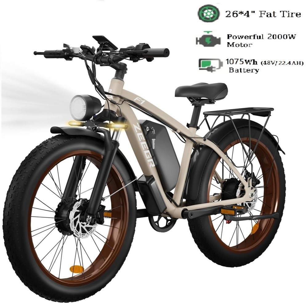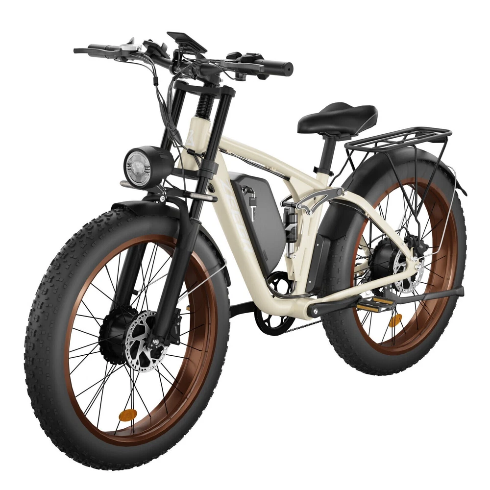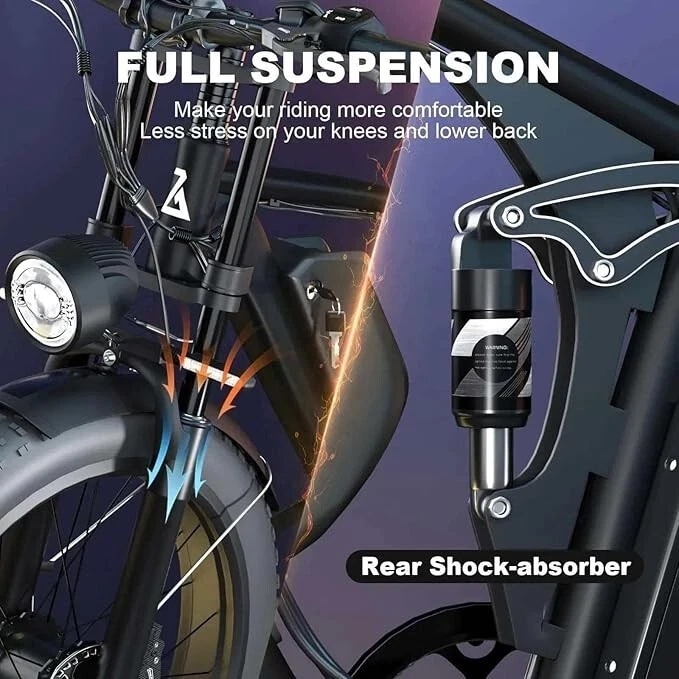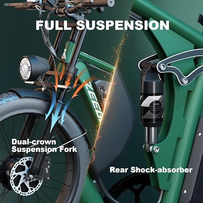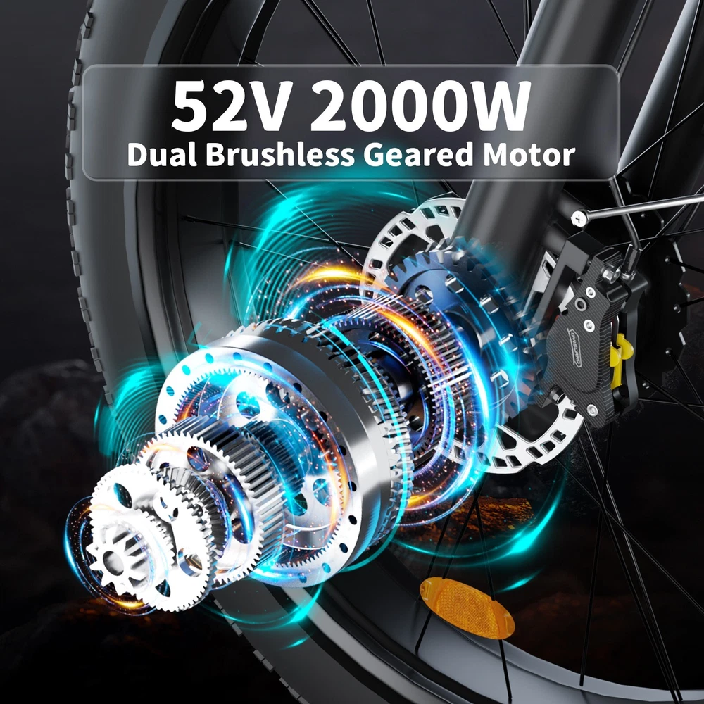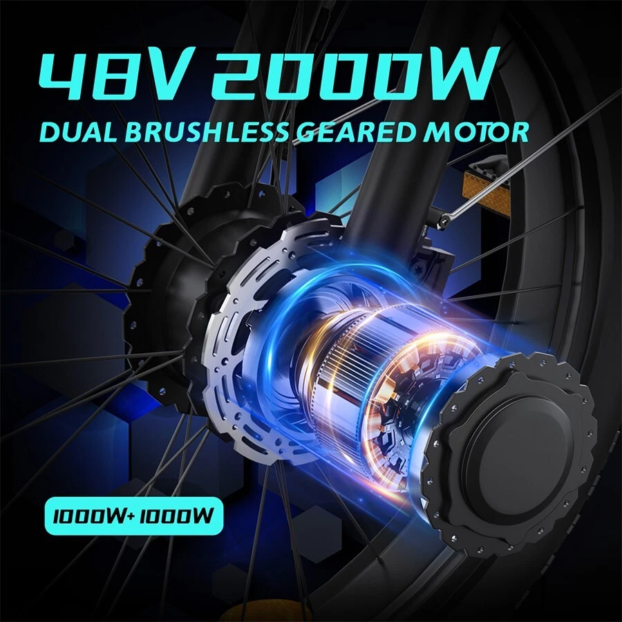 S1 Full Suspension Description 【Dual Motor Electric Bikes for Adults】 TWO upgraded 48V / 52V 1000W high speed Front & Rear brushless motors provide electric bicycles with stronger power and climbing ability, helps to reach the top speed of 35MPH with ease. Removable large capacity 48V/52V 22.4Ah battery offers a long riding range up to 40-60 miles in pedal assist mode. It takes only 5-8 hours to fully charge the battery 【Big Capacity Lithium Battery Ebike】 Large capacity 48V / 52V 22.4Ah battery offers ebikes long riding range of 40-60 miles,the waterproof battery of ebike is not only large capacity and long lasting, but it's also removable, convenient to take home or office for charging.Upgraded 54.6V 2A charger completes charging quickly in 5-8 hours 【Full Suspension 26" Fat Tire Electric Bike】 Equipped with a dual-crown front suspension fork and rear shock absorber , which greatly reduces bumps during riding. 26" x 4" fat tires also provide good grip and excellent shock absorption. This full suspension ebike offers a more comfortable riding experience in the snow, beach, mountain, city roads, helps you conquer most road conditions 【Hydraulic oil Brakes & Shimano 7 Speed Gears】 The ebikes for adults adopt front and rear hydraulic oil brakes, which provides more effective braking in rainy weather, heavy off-road, long downhill and adverse conditions. The bike frame is made of high quality 6061 aluminum alloy, more lightweight and durable. Equipped with professional Shimano 7 speed gears, more accurate and stable 【 5 Riding Modes 】 Enjoy versatile riding with 5 modes: dual motor electric, single motor electric, pedal assist, cruise, and bike mode. With 5 levels of assist, the bike can reach speeds up to 35 mph, depending on battery charge, load, and road conditions. Choose from speeds of 12, 18, 24, 29, or 35 mph.Whether cruising or conquering tough terrain, ride faster, farther, and freer. Don’t just ride—feel the power beneath you! 【Upgraded Lights for Night Riding】 The color LCD display keeps track of real-time speed, battery level, pedal assist level and mileage. This electric bicycle comes with an upgraded bright headlight & turn signals & rear brake light, making you visible and safe at night 【Easy to Assemble】 This e-bike comes 85% pre-assembled. 【1-year warranty】If there is any problem, pls contact us, we’ll reply your message within 24 hours. Pls keep the original bike box for 30 days for possible return 【Custom Service】 Contact US: Monday - Friday (9:00 AM - 6:00 PM); Saturday - Sunday (Closed). Due to the time - zone differences, please be informed that all emails will be replied to within 24 - 48 hours. We appreciate your patience and understanding during this time. We provide lifetime technical support, and committed to providing 1-Year warranty service. Specification S1 Double Engine Electric Bicycles, (Front 1000W + Rear 1000W), 1x 52V 22.4AH Battery Waterproof Wiring, Shimano 7 Speed MTB 26" Fat Tires 1. Wheel size: 26" 2. Frame: 18", Aluminum Alloy 6061 3. Handlebar Sets: Aluminum Alloy with Matte, H31.8*680,S31.8*90, SP31.6*350mm 4. Fork: Dual Crown suspension, Rear shock 1000 pounds 5. Shifting Lever: SHIMANOTX50-7,SHIMANOTZ30 & TY500 7PS 6. Crank sets: Aluminum alloy, Square hole, 48T 7. Brake:Brand Logan Hydraulic oil brake 8. Tire: CHAOYANG 26"* 4.0" 9. Riding Mode: Electric Power Assist(5shifts); Pure Electric(5shifts); Pure Human riding 7 Speed, cruise function 10. Travel Range: Pure Electric 20~25Miles; Electric Power Assist 40~60Miles 11. Max Speed: 35mph,Battery Charging Time: 8~10 hours 12. Monitor: 81F Middle digital display F1Upgrade AWD Dual Motors Dual Batteries (Dual 48V 22.4AH Battery) 【Dual Powerful 2000W Motors】 Equipped with total 2000W high speed brushless motors(Front & Rear), our ebikes can deliver great power, faster start-ups, and enhanced hill climbing ability. The top speed of our electric bike can be up to 35 MPH, which can give you an exciting level of acceleration, making driving fun and enjoyable. Whether for work, school, or outdoor exploration, it fulfills all needs. 【Dual 48V 22.4 Battery 】 Dual batteries cover a range of 70-120 miles per charge (5-8 hours) so that it can meet travel or daily commute needs. Utilizing pedal assist, the range extends to an impressive 120 miles (single motor) and 70 miles (dual motors), with throttle mode, it covers up to 60 miles (single motor) and 40 miles (dual motors) .ensuring you travel without worries. (Calculation based on rider's weight of 75kg. Range varies according to road condition, weather, rider's weight etc.) Removable battery makes charging more convenient whether you are at home or in the office. Dual battery ebike with unique keys makes you enjoy a safe and comfortable riding. It boasts an IP65 waterproof rating for adding durability. 【Front Suspension and Hydraulic Disc Brakes】 Adopting high-strength shock absorbing fork with with mechanical lockout can absorb the bumps of long-distance rugged road. Ebikes for adults use dual disc brakes, which provides more sensitive and effictive braking in adverse conditions, which enhances the safety when riding. The 7-speed gear system caters to all your riding and training needs with little noise. 【Anti-slip and Wear-resistant Tires】 26" fat tire electric dirt bike can confront any surfaces with confidence, unparalleled stability and traction whether it's cruising along sandy beaches, navigating rocky trails, or conquering urban streets and tackle any challenge, making your e-bike adapted to complex terrains and keep you safe. Fat tires are more anti-slip and wear-resistant than small thin tires. 【4 Working Modes】 Pure electric, pedal assist and pure human riding modes with different shifts for you, you can feel free to switch your riding mode according to your needs or mood. Frontlight, taillight and turnlight let other drivers see you and illuminate your path, making you ride electric 
