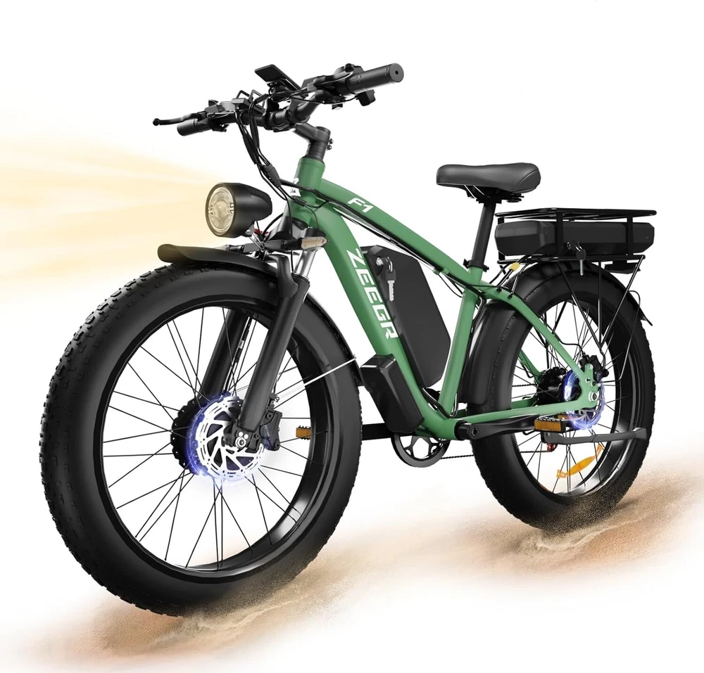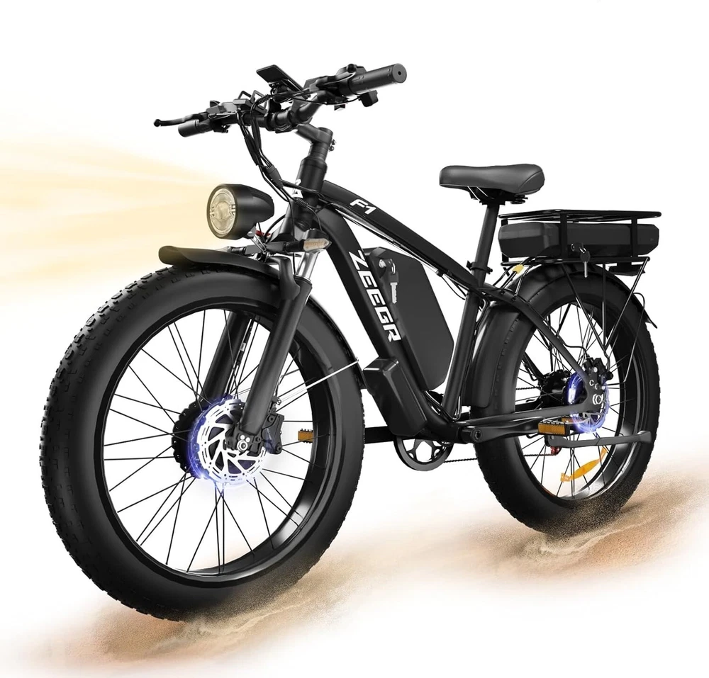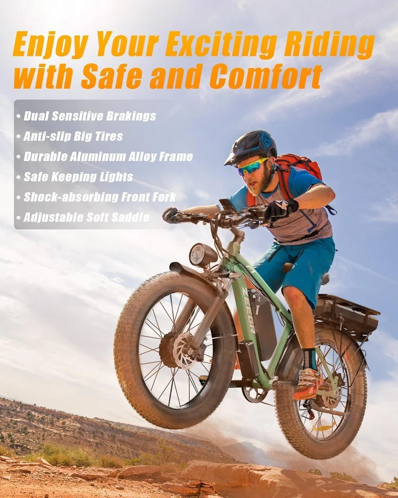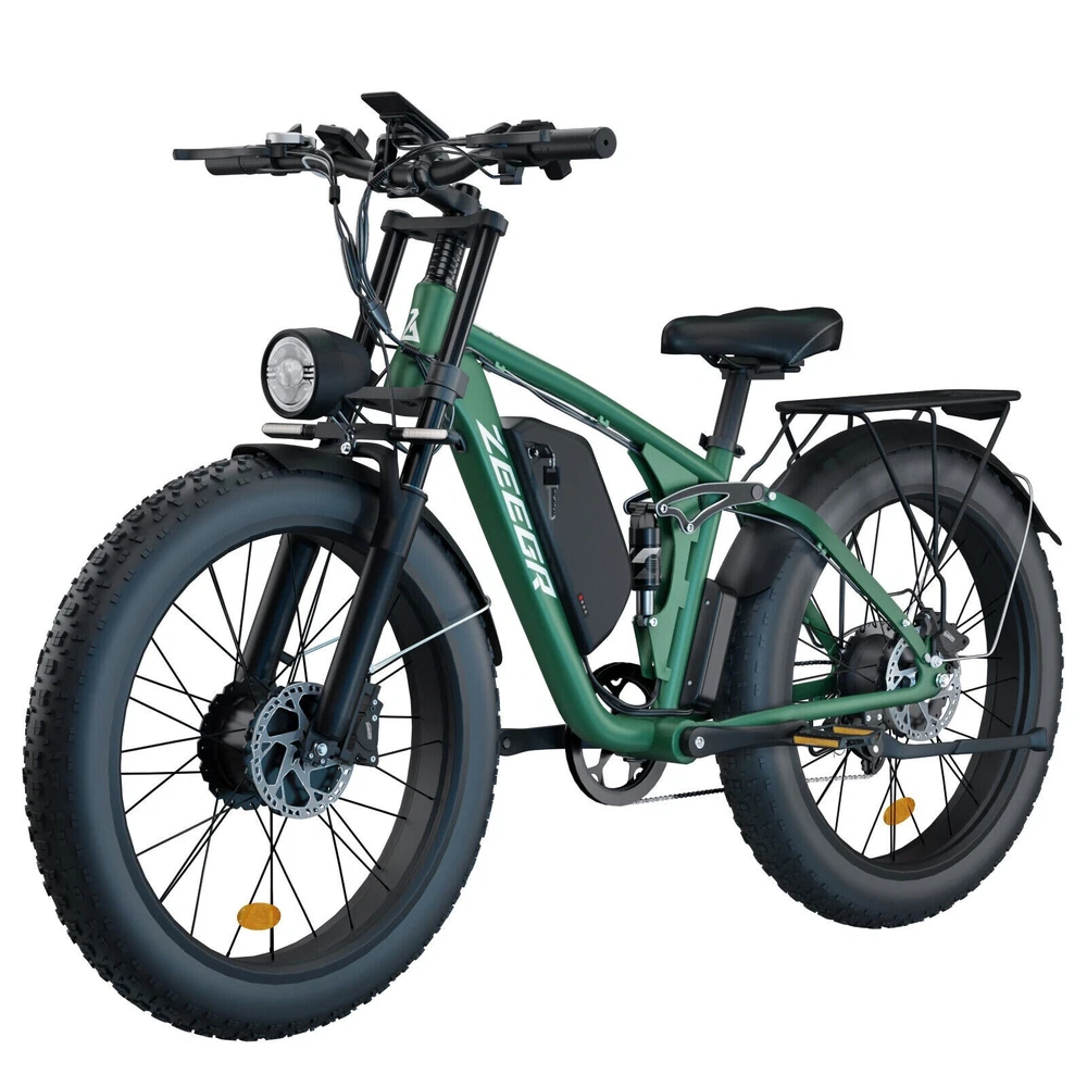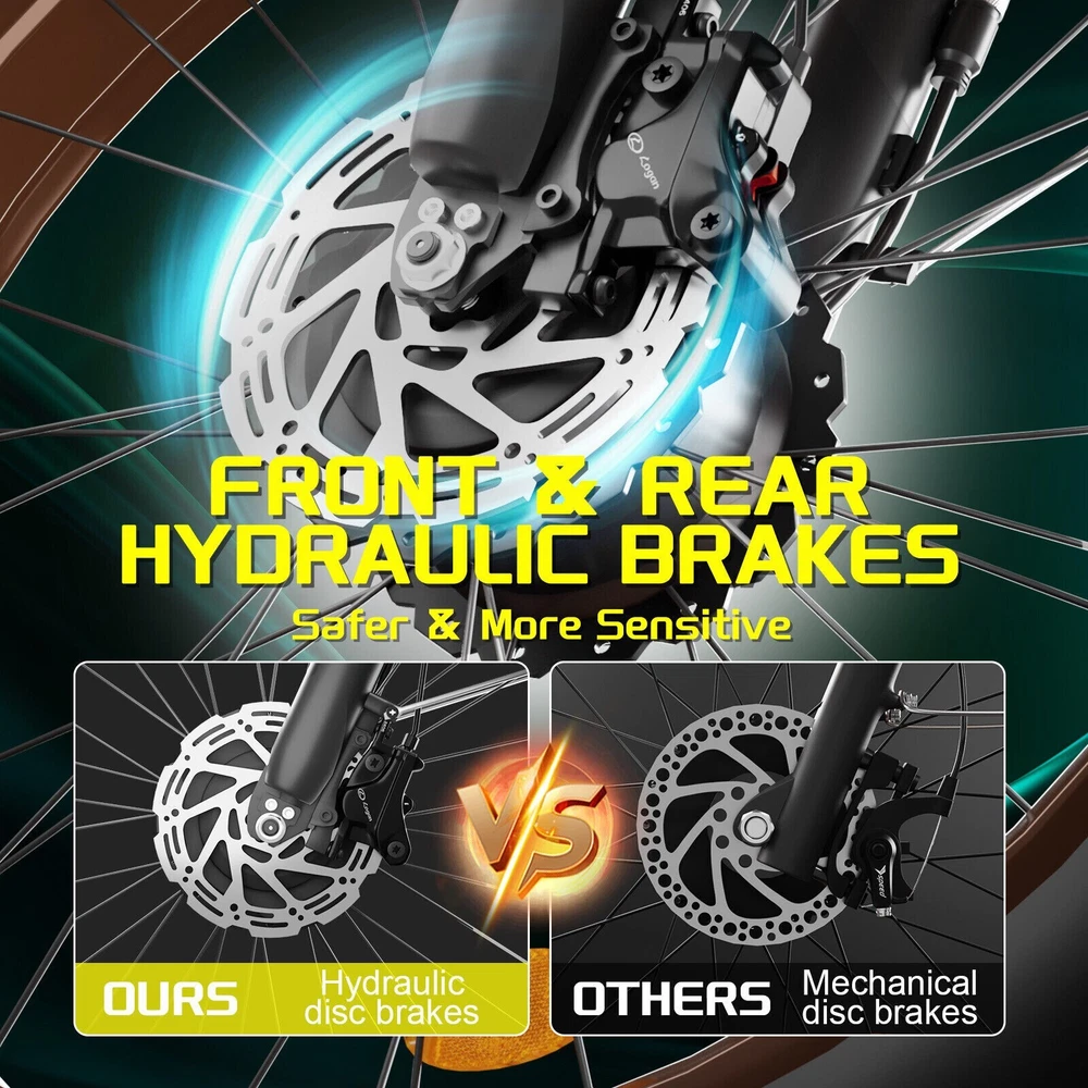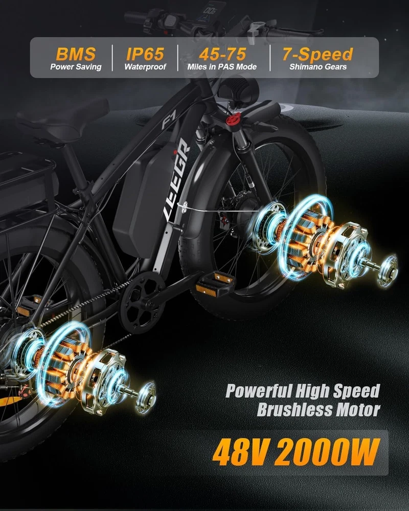 S1 Full Suspension Description 【Dual Motor Electric Bikes for Adults】 TWO upgraded 48V / 52V 1000W high speed Front & Rear brushless motors provide electric bicycles with stronger power and climbing ability, helps to reach the top speed of 35MPH with ease. Removable large capacity 48V/52V 22.4Ah battery offers a long riding range up to 40-60 miles in pedal assist mode. It takes only 5-8 hours to fully charge the battery 【Big Capacity Lithium Battery Ebike】 Large capacity 48V / 52V 22.4Ah battery offers ebikes long riding range of 40-60 miles,the waterproof battery of ebike is not only large capacity and long lasting, but it's also removable, convenient to take home or office for charging.Upgraded 54.6V 2A charger completes charging quickly in 5-8 hours 【Full Suspension 26" Fat Tire Electric Bike】 Equipped with a dual-crown front suspension fork and rear shock absorber , which greatly reduces bumps during riding. 26" x 4" fat tires also provide good grip and excellent shock absorption. This full suspension ebike offers a more comfortable riding experience in the snow, beach, mountain, city roads, helps you conquer most road conditions 【Hydraulic oil Brakes & Shimano 7 Speed Gears】 The ebikes for adults adopt front and rear hydraulic oil brakes, which provides more effective braking in rainy weather, heavy off-road, long downhill and adverse conditions. The bike frame is made of high quality 6061 aluminum alloy, more lightweight and durable. Equipped with professional Shimano 7 speed gears, more accurate and stable 【 5 Riding Modes 】 Enjoy versatile riding with 5 modes: dual motor electric, single motor electric, pedal assist, cruise, and bike mode. With 5 levels of assist, the bike can reach speeds up to 35 mph, depending on battery charge, load, and road conditions. Choose from speeds of 12, 18, 24, 29, or 35 mph.Whether cruising or conquering tough terrain, ride faster, farther, and freer. Don’t just ride—feel the power beneath you! 【Upgraded Lights for Night Riding】 The color LCD display keeps track of real-time speed, battery level, pedal assist level and mileage. This electric bicycle comes with an upgraded bright headlight & turn signals & rear brake light, making you visible and safe at night 【Easy to Assemble】 This e-bike comes 85% pre-assembled. 【1-year warranty】If there is any problem, pls contact us, we’ll reply your message within 24 hours. Pls keep the original bike box for 30 days for possible return 【Custom Service】 Contact US: Monday - Friday (9:00 AM - 6:00 PM); Saturday - Sunday (Closed). Due to the time - zone differences, please be informed that all emails will be replied to within 24 - 48 hours. We appreciate your patience and understanding during this time. We provide lifetime technical support, and committed to providing 1-Year warranty service. Specification S1 Double Engine Electric Bicycles, (Front 1000W + Rear 1000W), 1x 52V 22.4AH Battery Waterproof Wiring, Shimano 7 Speed MTB 26" Fat Tires 1. Wheel size: 26" 2. Frame: 18", Aluminum Alloy 6061 3. Handlebar Sets: Aluminum Alloy with Matte, H31.8*680,S31.8*90, SP31.6*350mm 4. Fork: Dual Crown suspension, Rear shock 1000 pounds 5. Shifting Lever: SHIMANOTX50-7,SHIMANOTZ30 & TY500 7PS 6. Crank sets: Aluminum alloy, Square hole, 48T 7. Brake:Brand Logan Hydraulic oil brake 8. Tire: CHAOYANG 26"* 4.0" 9. Riding Mode: Electric Power Assist(5shifts); Pure Electric(5shifts); Pure Human riding 7 Speed, cruise function 10. Travel Range: Pure Electric 20~25Miles; Electric Power Assist 40~60Miles 11. Max Speed: 35mph,Battery Charging Time: 8~10 hours 12. Monitor: 81F Middle digital display F1Upgrade AWD Dual Motors Dual Batteries (Dual 48V 22.4AH Battery) 【Dual Powerful 2000W Motors】 Equipped with total 2000W high speed brushless motors(Front & Rear), our ebikes can deliver great power, faster start-ups, and enhanced hill climbing ability. The top speed of our electric bike can be up to 35 MPH, which can give you an exciting level of acceleration, making driving fun and enjoyable. Whether for work, school, or outdoor exploration, it fulfills all needs. 【Dual 48V 22.4 Battery 】 Dual batteries cover a range of 70-120 miles per charge (5-8 hours) so that it can meet travel or daily commute needs. Utilizing pedal assist, the range extends to an impressive 120 miles (single motor) and 70 miles (dual motors), with throttle mode, it covers up to 60 miles (single motor) and 40 miles (dual motors) .ensuring you travel without worries. (Calculation based on rider's weight of 75kg. Range varies according to road condition, weather, rider's weight etc.) Removable battery makes charging more convenient whether you are at home or in the office. Dual battery ebike with unique keys makes you enjoy a safe and comfortable riding. It boasts an IP65 waterproof rating for adding durability. 【Front Suspension and Hydraulic Disc Brakes】 Adopting high-strength shock absorbing fork with with mechanical lockout can absorb the bumps of long-distance rugged road. Ebikes for adults use dual disc brakes, which provides more sensitive and effictive braking in adverse conditions, which enhances the safety when riding. The 7-speed gear system caters to all your riding and training needs with little noise. 【Anti-slip and Wear-resistant Tires】 26" fat tire electric dirt bike can confront any surfaces with confidence, unparalleled stability and traction whether it's cruising along sandy beaches, navigating rocky trails, or conquering urban streets and tackle any challenge, making your e-bike adapted to complex terrains and keep you safe. Fat tires are more anti-slip and wear-resistant than small thin tires. 【4 Working Modes】 Pure electric, pedal assist and pure human riding modes with different shifts for you, you can feel free to switch your riding mode according to your needs or mood. Frontlight, taillight and turnlight let other drivers see you and illuminate your path, making you ride electric 