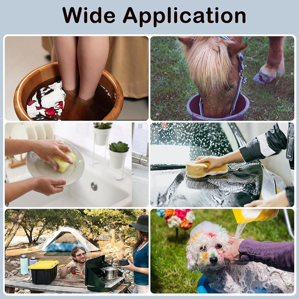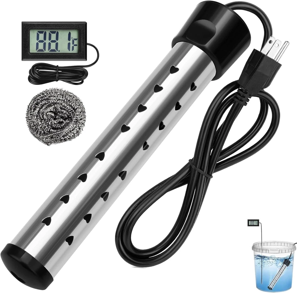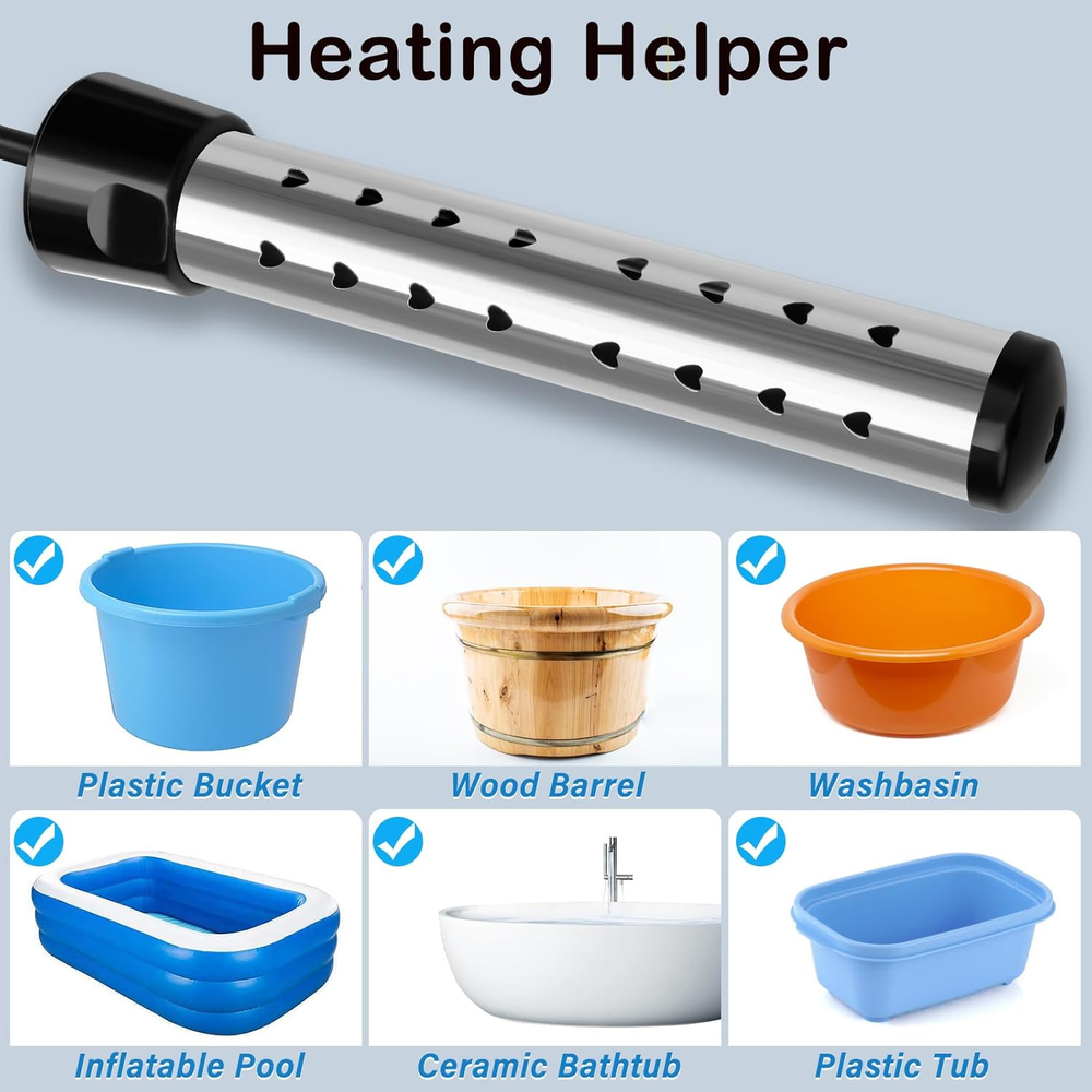 Fast Heating: The 2000W electric water heater features a porous design with excellent thermal conductivity. It will quickly heat 5 gallons of water with high power within a few minutes. If too much water is heated, it may take longer or require the use of two or more immersion water heater. Safety Design: Instant water heater, equipped with high-quality stainless steel protective cover, effectively preventing direct contact between heating elements and humans or animals, rust proof and safety. Our upgraded design ensures optimal performance. It is recommended not to use continuously for more than three hours and not to forget to unplug the power. Easy To Operate: Immerse the bucket heater in water at the appropriate level and plug it into any grounded 120V AC socket. Equipped with a digital LCD thermometer, it is easy to measure water temperature. Check the power indicator light to ensure that the immersion water heater is working properly. Note: When the portable water heater is working, people and animals should not be in the water. Widely Applicable: Immersion water heaters can be used not only in small inflatable swimming pools (multiple in use), but also in hot tubs, bathtubs, buckets, washbasins, camping showers, and more. This hot tub heater is easy to carry and ultra lightweight, making it perfect for travel and road trips. Packaging Includes: Before using the immersion heater, please carefully read the instructions and follow the precautions. Our portable water heater includes 1 pool water heater, 1 digital thermometer, 1 stainless steel cleaning ball, and 1 instruction manual. Product Description