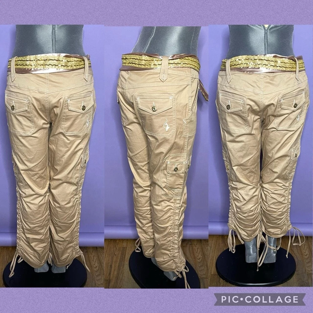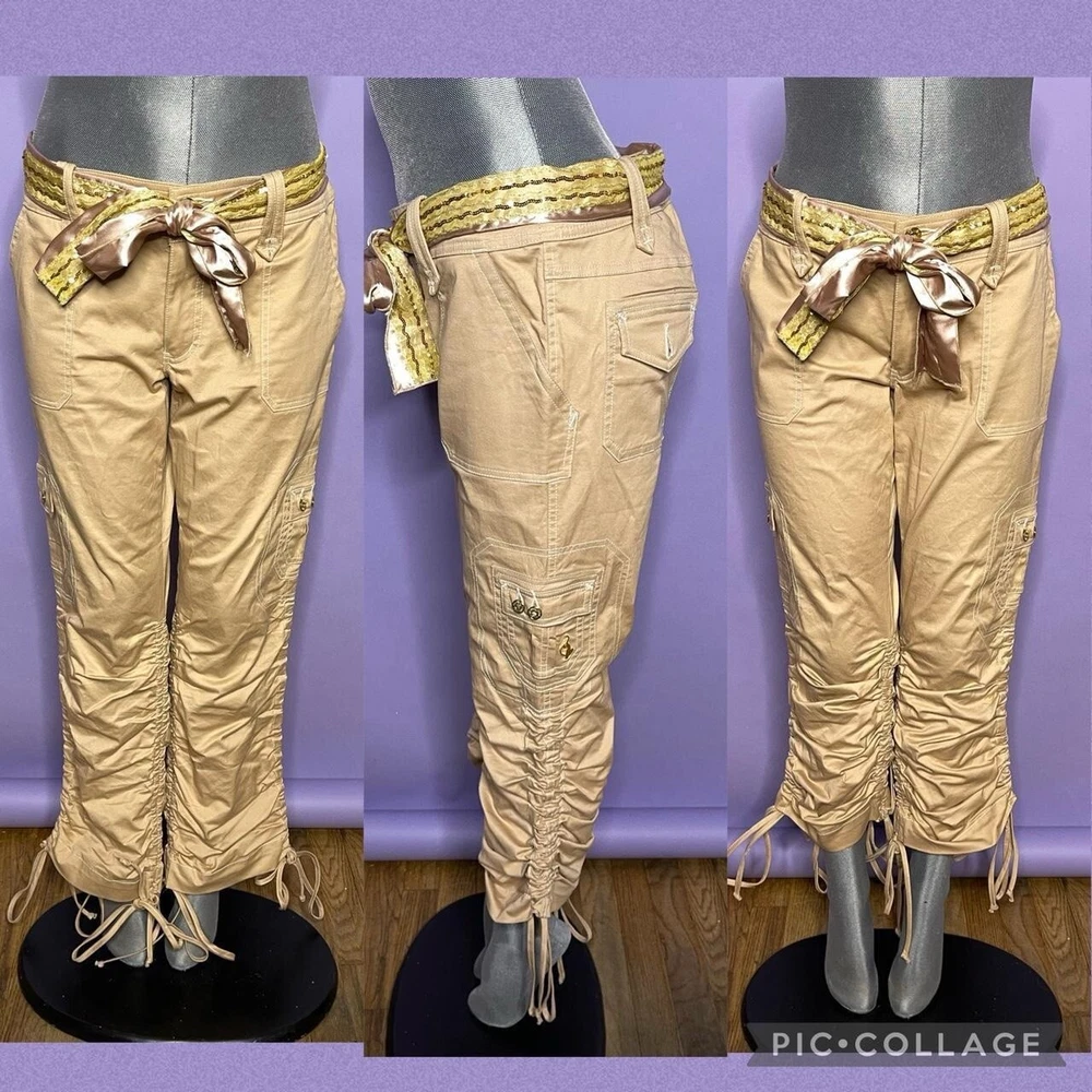 2000s tan mid rise Baby Phat cargo pants💗 Comes with a silk sequin belt, legs also cinches to wear cropped!🦋 Mid rise fit, The pants also have gold details!✨ Brand; Baby Phat, Tag size; Womens 9 ALL MEASUREMENTS TAKEN WITHOUT BELT WAIST; 32in-34in (16in flat & 17in pulled tight) HIPS; 39in-43in (19.5in flat & 21.5in pulled) FULL LENGTH; 37in (measured from the side) THIGH; over 22in-26in (over 11in & 13in pulled) FRONT RISE; over 9in BACK RISE; 12.5in INSEAM; 23.5in-27.5in (cinched & full length) FLARE/LEG OPENING; 9in Fabric has some stretch! In worn & faded condition! Has scuffs, snags, pilling, stains & marks! The belt also has snags! Also has pilling in between thighs!🔎 Not all flaws are photographed, I’m NOT responsible for the fit, (first photo is edited!) model has the item pinned back! SOLD AS IS!
