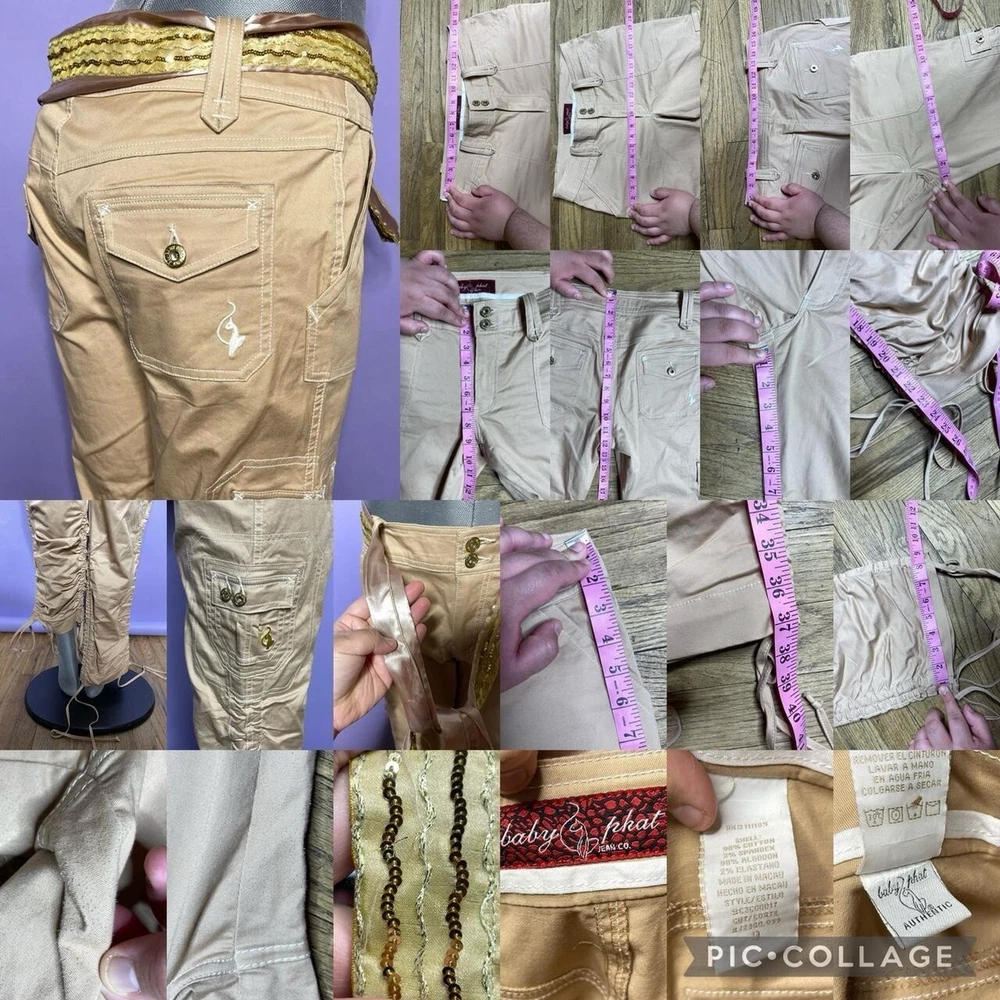 Occasion: Casual Brand: Baby Phat gtin13: Does not apply Material: Cotton Blend, Spandex, Cotton Inseam: See description Leg Style: cargo Theme: Beach, College, Festival, Hip Hop, Movie, TV, 2000s, Y2k, Popstar Personalize: No Color: Tan / Gold Accents: Sequin Closure: Tie, Zip Department: Women UPC: Does not apply Type: Pants Vintage: No Handmade: No Size Type: Regular Garment Care: Machine Washable Front Type: Flat Front Size: 9 Features: Crop, Cinch Waist Size: See description Fit: Regular Style: Cargo