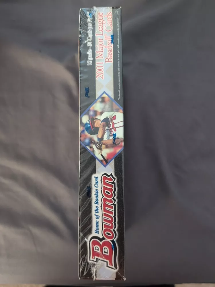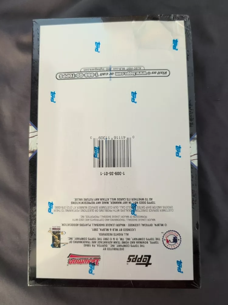 The product is a 2001 Bowman Baseball Hobby Box containing 240 cards from the Major League (MLB). It includes cards of players like Alex Rodriguez, Miguel Cabrera, Albert Pujols, and Derek Jeter. The box is autographed and may contain an autographed rookie card of Albert Pujols. It is factory sealed and features an Albert Pujols rookie and Miguel Cabrera error cards. The set is vintage and manufactured in the United States.