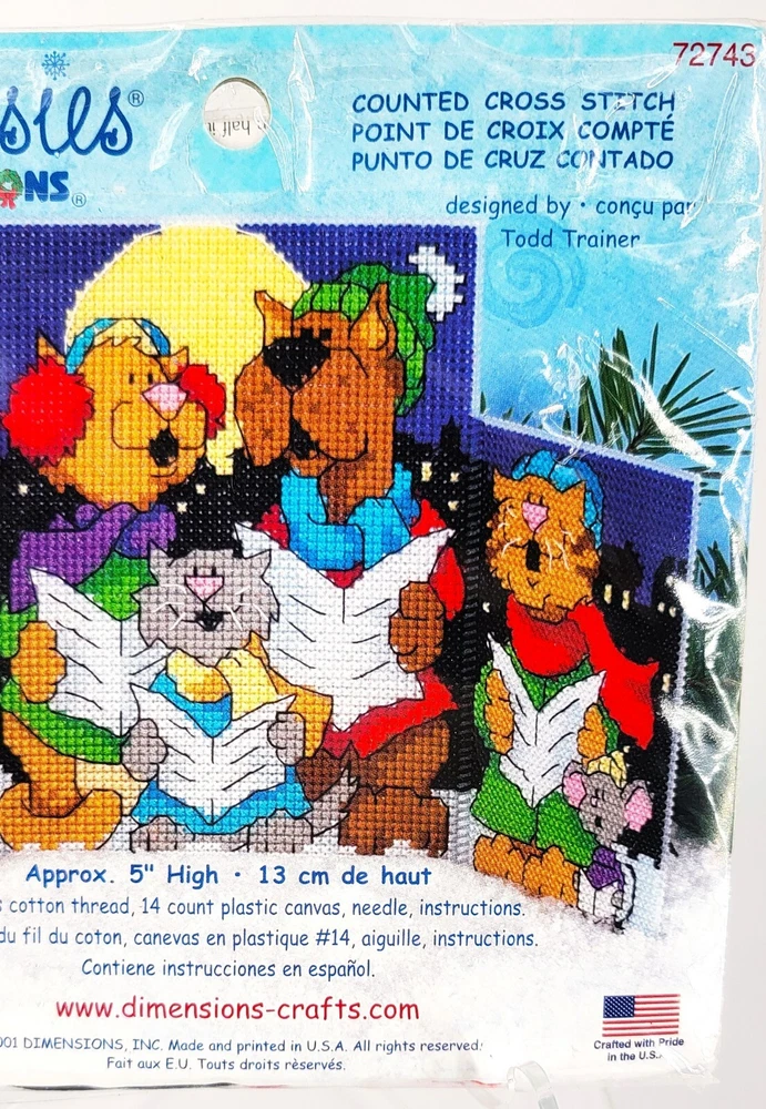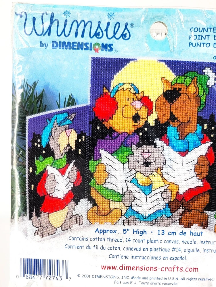 BRAND: 2001 NOS Dimensions Whimsies Singing Cats and Dogs Counted Cross Stitch Colorful Kit. Made in USA. KIT INCLUDES: Cotton Thread, 14 Count Plastic Canvas, Needle, Instructions. Please see My Photos for Exact Details. Thank you for stopping by today and please come again!!