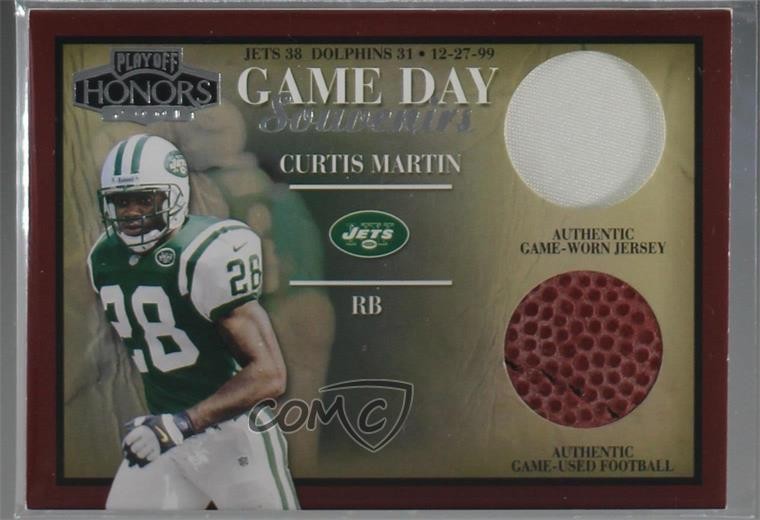 2001 Playoff Honors - Game Day - Souvenirs Dual Football Prime Jersey #GD-31 Curtis Martin Qty Made: 25 - Football Card - Featuring the New York Jets - Featuring Curtis Martin Search for more: 2001 Playoff Honors Search for more: 2001 Playoff Honors - Game Day - Souvenirs Dual Football Prime Jersey View all of our Listings Auctions Buy It Now About Us Located in the beautiful Pacific Northwest, COMC (Check Out My Cards) is the world's largest consignment service for trading card singles. More than 10,000 people have used our consignment service to list over 50 million trading cards. Find out how we can help you consign your items on eBay by contacting us through eBay messaging. COMC -- "The Safe & Easy Way to Buy & Sell" Representative Image - Select Specific Item above to see image of actual item Representative Image - Select Specific Item above to see image of actual item Raw Condition for Modern Cards Unless otherwise noted, raw modern cards are listed in Near Mint-Mint condition or better. A NM-MT card appears to be Mint at first glance, but upon closer inspection, may exhibit some of the following: minor print defects (e.g. roller marks, print line, dimple), minor scratches, slight edge wear, and slight corner wear. Centering is clearly visible in the images provided and does not factor into our condition assessment. Raw Condition for Vintage Cards Unless otherwise noted, raw vintage cards are listed in Excellent condition or better. An EX card may exhibit some of the following: minor rounding of corners, surface wear, print defects, light scratches, and slight edge wear/chipping. Centering is clearly visible in the images provided and does not factor into our condition assessment. Domestic Shipping Combined shipping for multiple items is available. To receive combined shipping, please ensure all desired items are in your eBay shopping cart before proceeding to checkout. eBay limits orders to 40 items per order. We automatically combine multiple orders placed on the same day. If you place multiple orders on the same day, please contact us to request a refund of applicable shipping costs. Signature confirmation may be required on invoices over $400. All cards are protected and shipped securely. International Shipping COMC offers eBay's International Shipping (EIS) for international orders under $2,500* (see country exceptions below). All duties and import fees are paid at checkout; in the rare event that there are additional import fees upon delivery, these are borne by the buyer. EIS packages route through a shipping hub in Erlanger, KY before shipping to their final destination. Please note that EIS does not allow for combined shipments. The shipping rates are determined by eBay and cannot be adjusted. *Maximum sale price exceptions: Colombia, Kuwait ($2,000); Taiwan ($1,539); Chile, Costa Rica, Guatemala, Honduras, Trinidad and Tobago ($1,000); Antigua and Barbuda, Aruba, Belize, Dominica, Grenada, Philippines, Saint Kitts and Nevis, Saint Lucia, Montserrat, Turks and Caicos Islands ($500); Dominican Republic, El Salvador ($200). Please request a shipping quote through eBay messaging for orders that exceed the maximum sale price supported by eBay's International Shipping. You will be responsible for all duties and import fees for international orders shipped outside the EIS. All cards are protected and shipped securely. Payment COMC does not accept offers on our cards through our eBay storefront. COMC utilizes eBay’s managed payments system. If you are experiencing difficulties making a payment, please contact eBay for assistance. Return Policy Returns are only accepted on the rare occasion the item is not as described. If you are making a return, please initiate the return process through eBay so a mailing label can be provided for you. Prior to listing, our expert team carefully assessed this item to represent it accurately. Please review the description and high-definition images prior to purchasing to ensure this item meets your satisfaction. We welcome you to contact us if you have further questions about this item. Trust and Integrity COMC carefully assesses each item consigned to us to prevent fraudulent items from entering the marketplace. If you believe an item offered on COMC may be fraudulent, please contact us with details so we can investigate the issue. Items we determine are outside our supported items policy may be removed. Last Modified: 7/12/2025 7:58:28 AM PDT