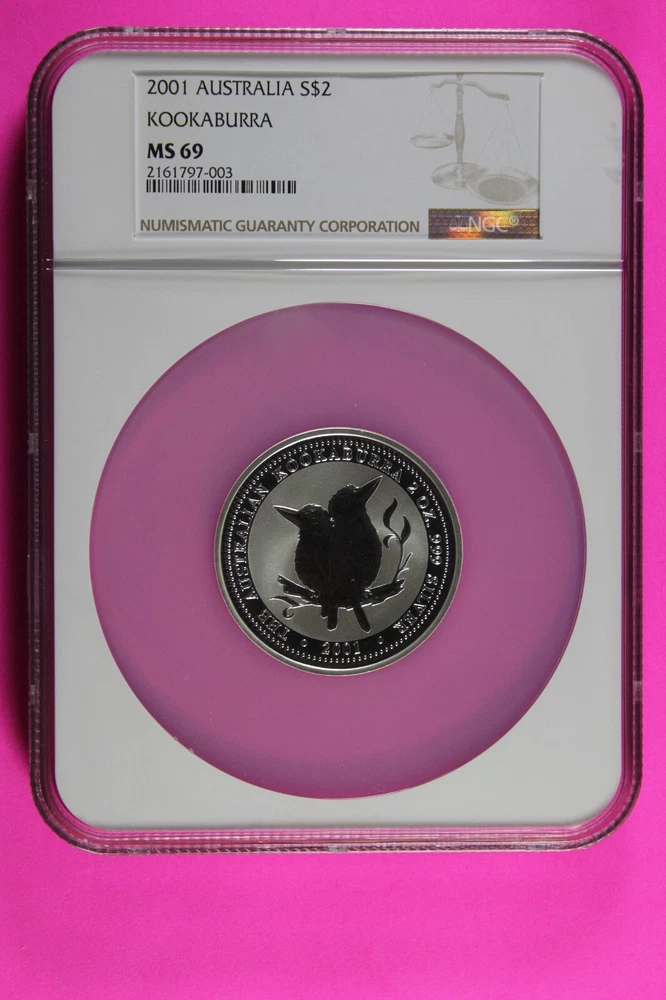 Brand/Mint: The Perth Mint Shape: Coin Certification: NGC Total Precious Metal Content: 2 Troy Ounces Grade: MS 69 Composition: Silver Year: 2001 Seller Notes: “You will receive the exact same coin in the pictures.” Country/Region of Manufacture: Australia Brand: Perth Mint Coin: Australian Kookaburra Precious Metal Content per Unit: 2 oz Fineness: 0.999 Strike Type: Satin