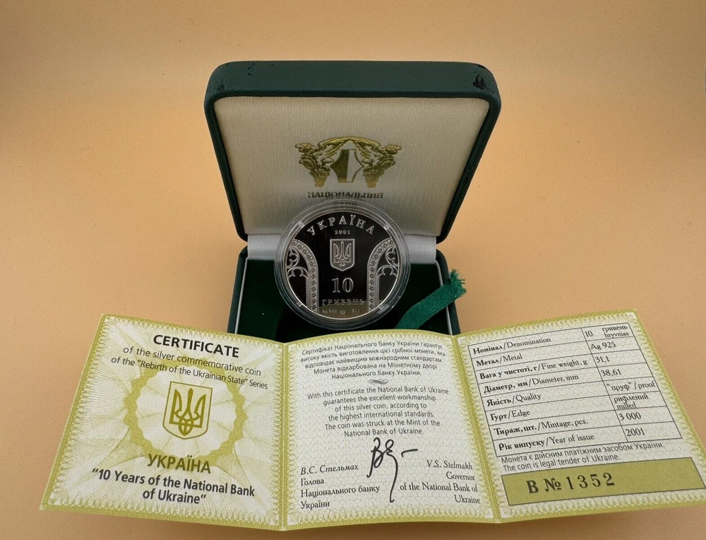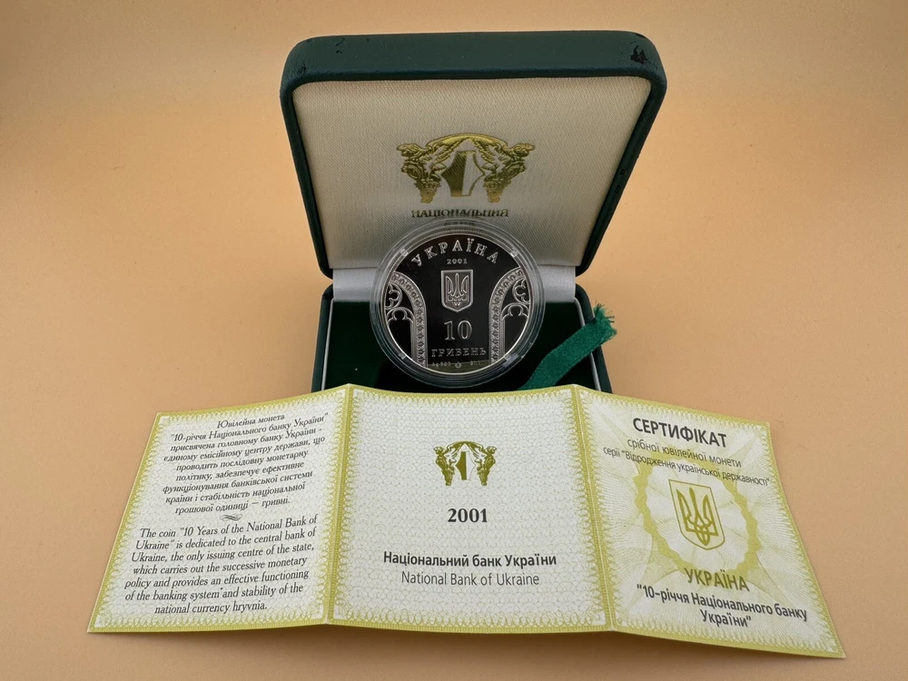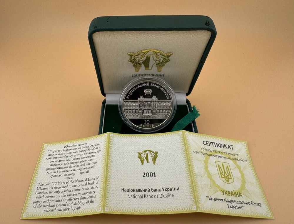 2001 Ukraine 10 Years of the National Bank of Ukraine Silver .925 1oz Coin COA The coin '10 Years of the National Bank of Ukraine' is dedicated to the central bank of Ukraine, the only issuing authority in the state. It carries out a consistent monetary policy, ensures the effective functioning of the banking system, and maintains the stability of the national currency, the hryvnia. Denomination 10 Hryvna Metal Silver 925 Weight 31.1g Diameter 38.61mm Proof Mintage 3000 Year of Issue 2001