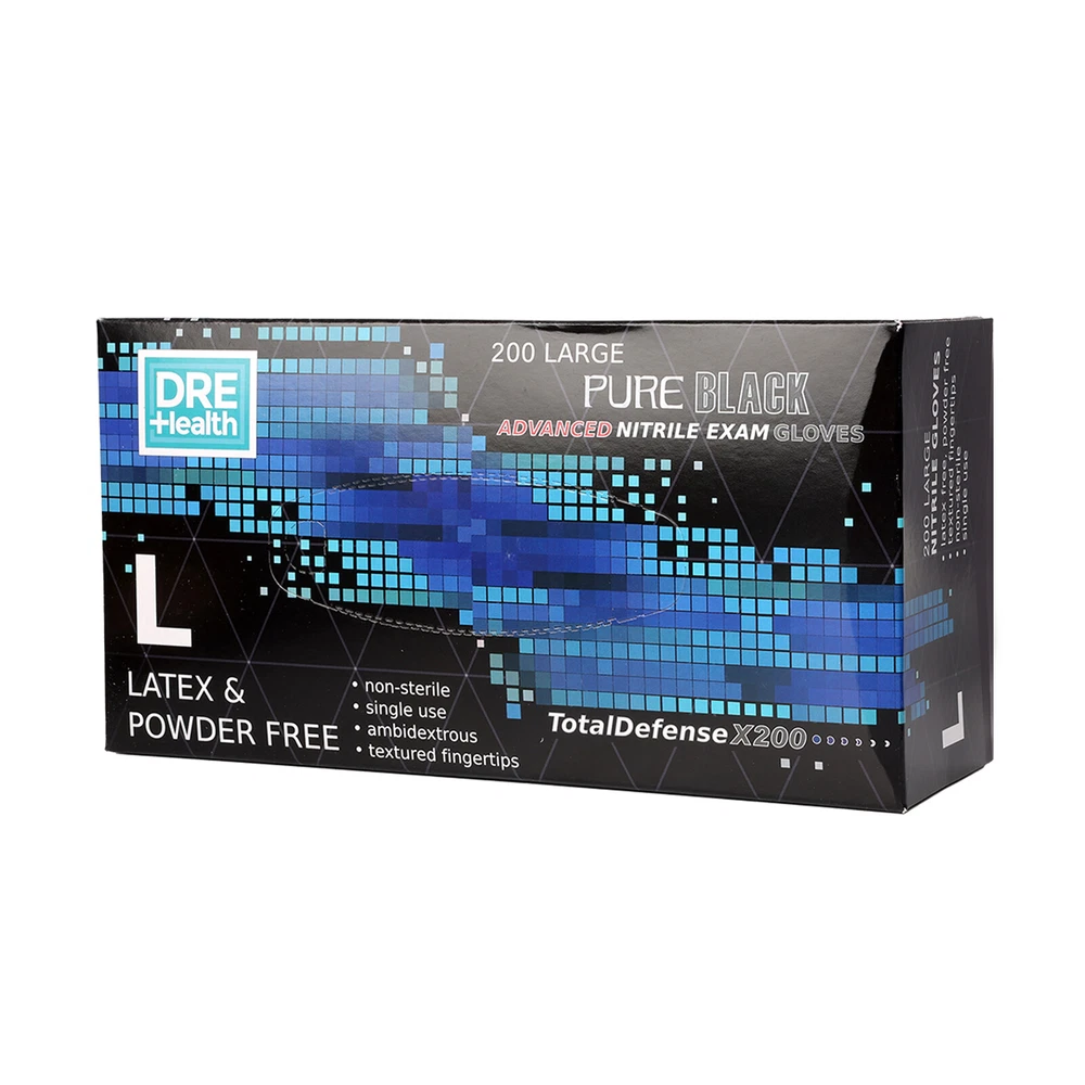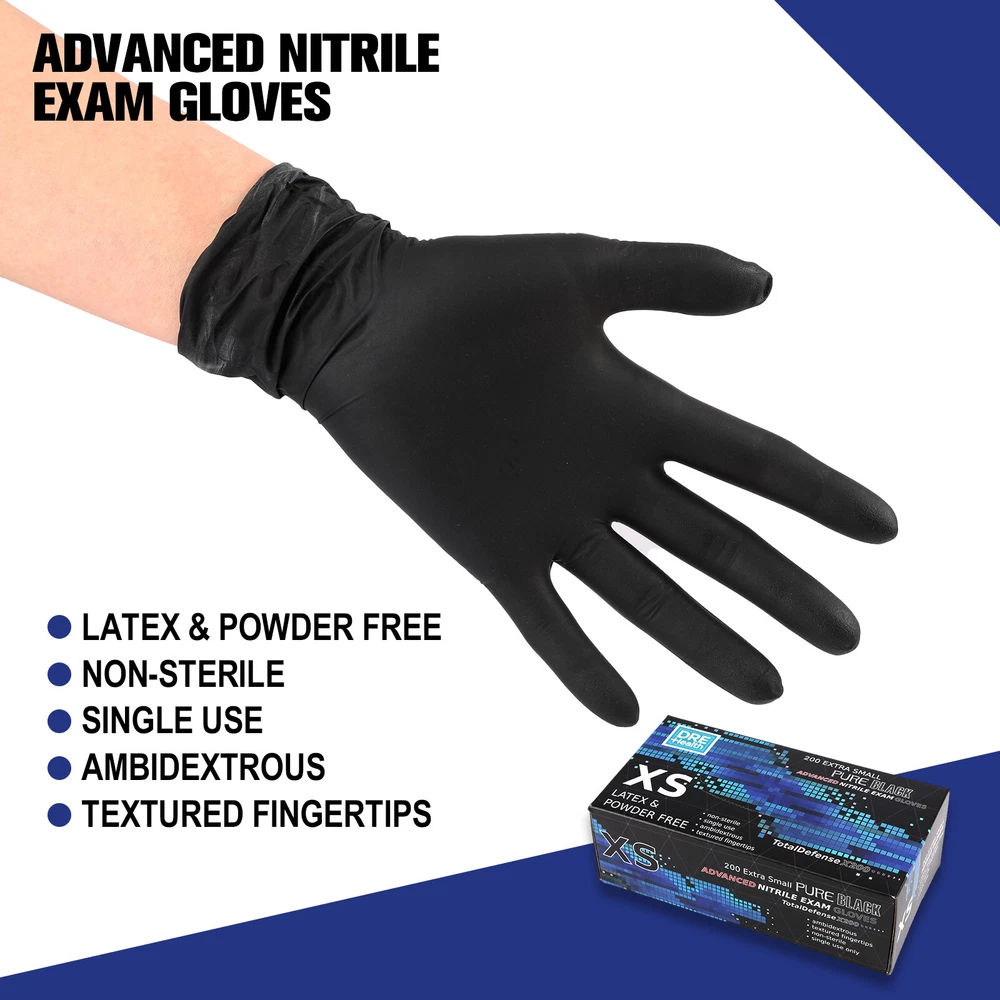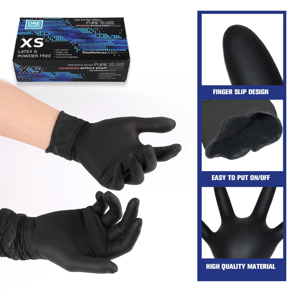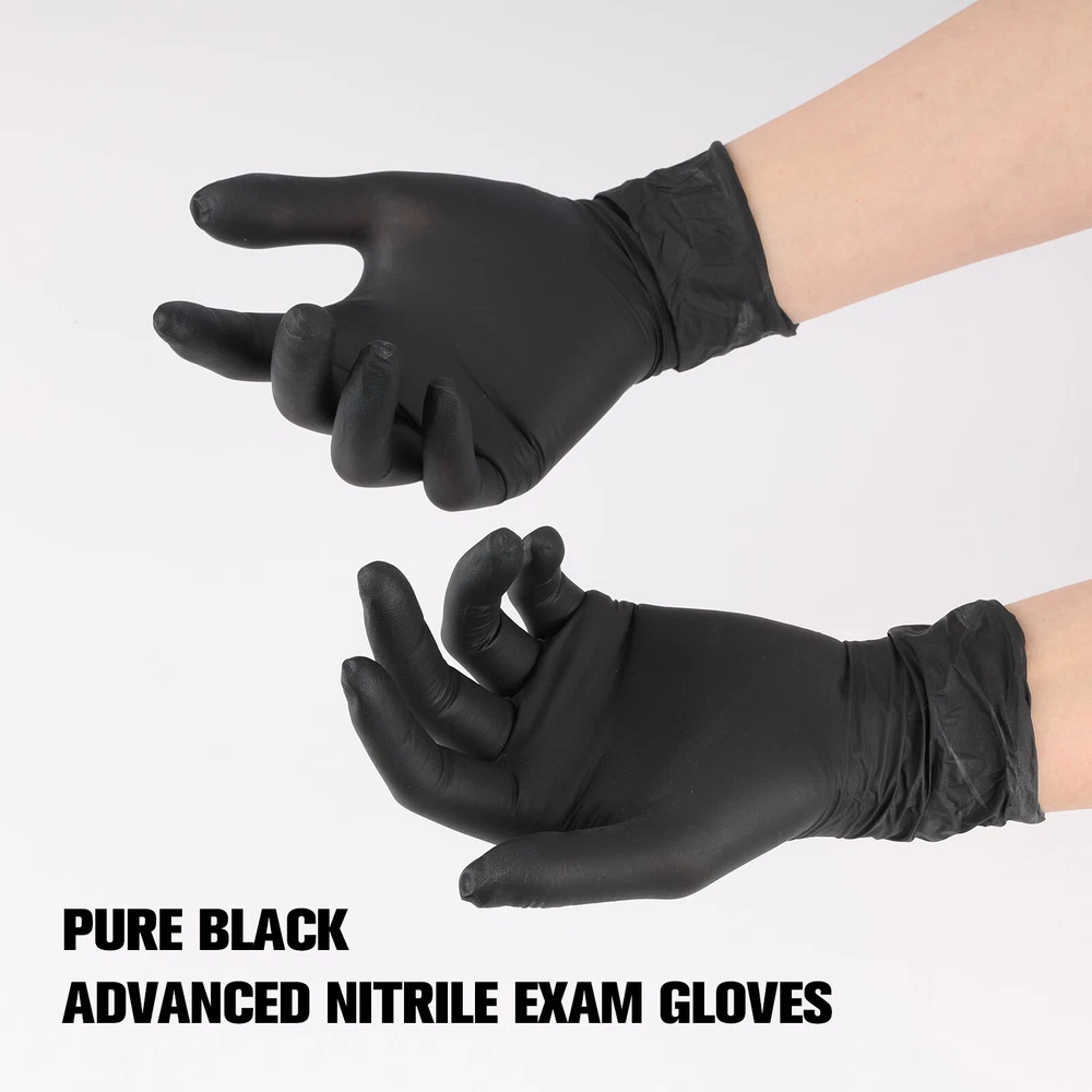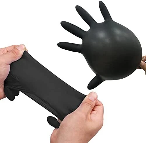 Product Description Product Description: Material: Nitrile Color: Black Features: High Quality: These black nitrile disposable gloves are 4 mils thick and offer good tear resistance, comfort, and durability. Comfortable and Healthy: Latex-free and powder-free. These gloves are an excellent choice for people sensitive or allergic to rubber and powders. Easy to Use: Unique production technology makes the inner side much smoother and easy to wear and take off. The elastic design provides superior comfort and dexterity for delicate tasks. Better protection for your hands. Multi-Purpose: These black disposable gloves look professional when cleaning dirt and grime. They are perfect for cleaning, hair coloring, tattooing, beauty salons, gardening, light housekeeping, food service, and janitorial. They can also be used for medical purposes, police investigations, lab work, etc. Multiple Sizes: These gloves are available in small, medium, large sizes, and extra large so that you can find the right glove for you. Package Includes: 1/2/3/4/5 Box of Black Nitrile Disposable Gloves (Each box contains 200 gloves) powered by You may also like