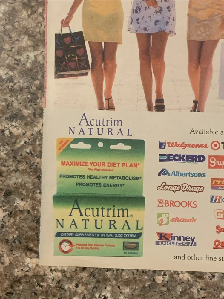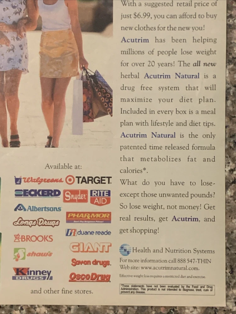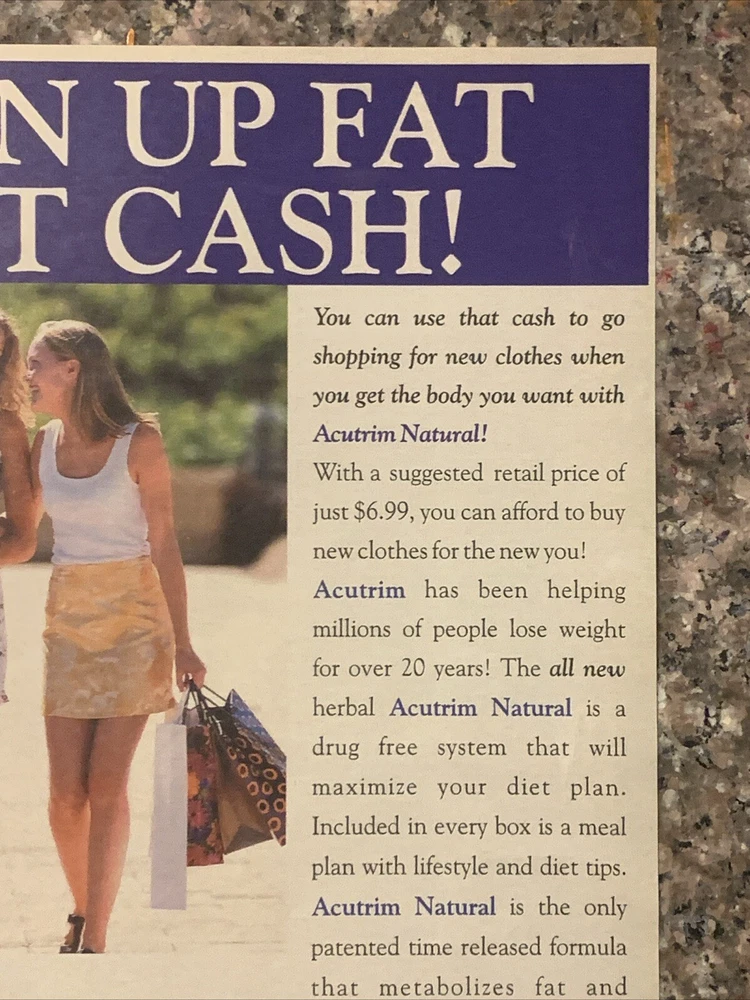 This vintage magazine print ad from 2002 promotes the Acutrim Natural Weight Loss System, a popular health and nutrition system. The multi-colored ad measures approximately 8"x11" and is an original piece from the United States. The ad is a great addition to any collection of health and beauty advertising or collectibles. It is a unique piece that captures the essence of the early 2000s health and wellness culture. Whether you're a fan of the brand or simply appreciate vintage advertising, this Acutrim Natural Weight Loss System fad print ad is a must-have.