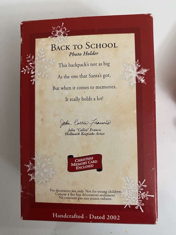 The 2002 Back to School Photo Holder Hallmark Keepsake Christmas Ornament is a small, irregularly shaped ornament featuring a contemporary style with a vintage touch. Handcrafted with a decorative multicolor design, this limited edition ornament includes a photo holder for a personal touch. Perfect for the Christmas season, this ornament features a school backpack subject, making it a sentimental keepsake for families with children aged 12-18 years. The ornament comes in its original open box packaging and weighs 2.1 oz, adding a unique and nostalgic addition to any holiday decor collection. Preowned in good condition. Box included