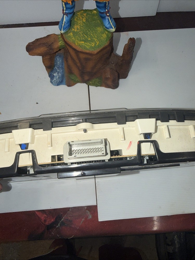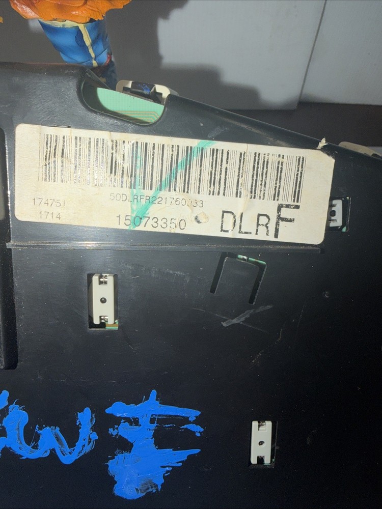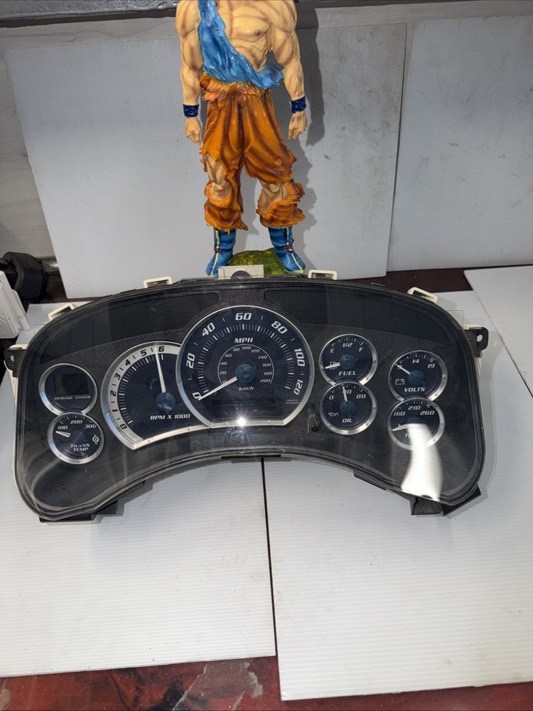 The product is a genuine OEM 2002 Cadillac Escalade Speedometer Cluster Assembly in black with a maximum speedometer value of 120 mph. It features a blue needle color, illuminated (backlit) display, and is a chromed style. The speedometer cluster assembly comes with a 1-month manufacturer warranty and is designed specifically for the Cadillac Escalade model. This assembly includes both analog and digital display types, making it a suitable replacement part for a vintage Cadillac vehicle.