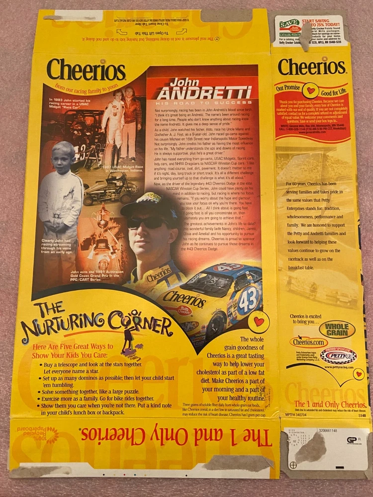 Opened and flatten 2002 Cheerios 15 oz John Andretti Standing. Box has shelf wear. I will ship First Class in between cardboard for protection during shipping. Please review photos and ask questions. International buyers ask before bidding. I will combine as many items as you want to save you money on shipping. Send me a request for all of the items you want or win, and I will send you an invoice. Shipping Costs are what I pay. Good luck.