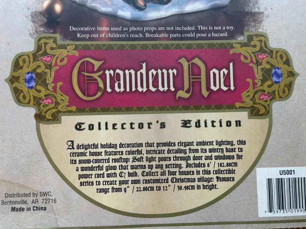 Collection: Collectors Edition Room: Any Room Subject: Villages Year Manufactured: 2002 Seller Notes: “Like new condition” Material: Ceramic & Porcelain Occasion: Christmas Type: House UPC: N/A Brand: Grandeur Noel gtin13: N/A Artist: n/a