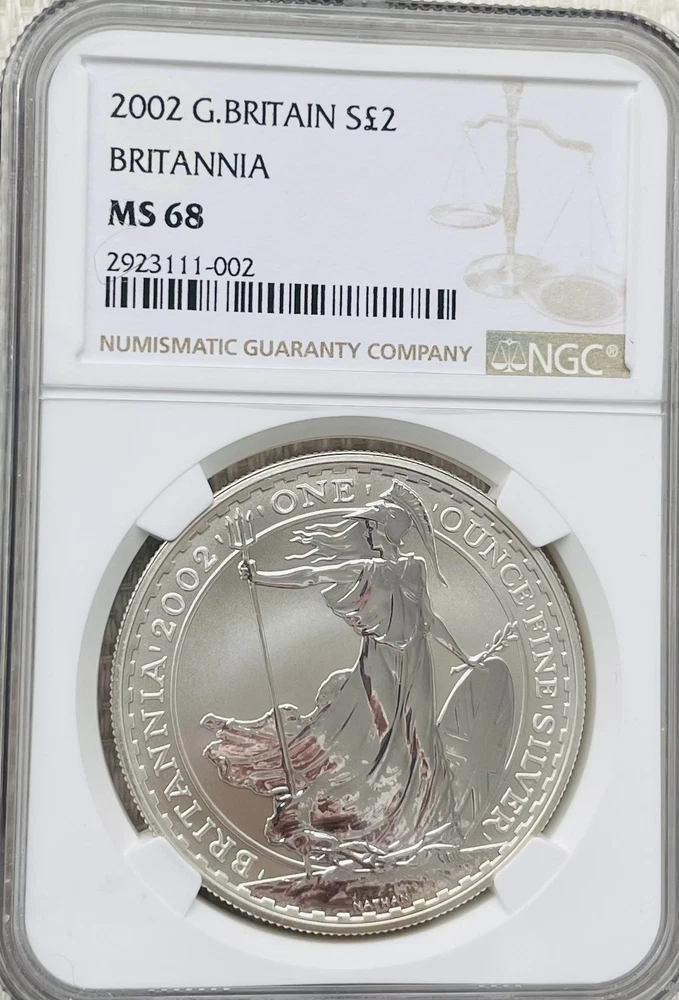 Total Precious Metal Content:1 ozModified Item:NoYear:2002Certification:NGCCoin:UK BritanniaGrade:MS 68Fineness:0.958Brand/Mint:British Royal MintCountry/Region of Manufacture:United KingdomStrike Type:UNCIRCULATEDComposition:SilverPrecious Metal Content per Unit:1 ozCertification Number:2923111-002