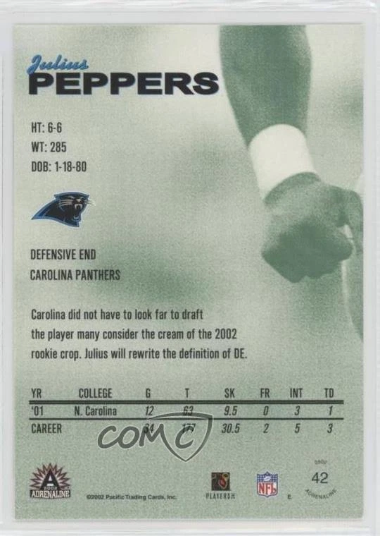 2002 Pacific Adrenaline - [Base] - Red #42 Julius Peppers - RC (Rookie Card) - Football Card - Featuring the Carolina Panthers - Featuring Julius Peppers Search for more: 2002 Pacific Adrenaline Search for more: 2002 Pacific Adrenaline - [Base] - Red View all of our Listings Auctions Buy It Now About Us Located in the beautiful Pacific Northwest, COMC (Check Out My Cards) is the world's largest consignment service for trading card singles. More than 10,000 people have used our consignment service to list over 50 million trading cards. We currently house 20 million cards, each listed for sale with front and back images of the actual card. Find out how we can help you consign your items on eBay by contacting us through eBay messaging. COMC -- "The Safe & Easy Way to Buy & Sell" Representative Image - Select Specific Item above to see image of actual item Representative Image - Select Specific Item above to see image of actual item Raw Condition for Modern Cards Unless otherwise noted, raw modern cards are listed in Near Mint-Mint condition or better. A NM-MT card appears to be Mint at first glance, but upon closer inspection, may exhibit some of the following: minor print defects (e.g. roller marks, print line, dimple), minor scratches, slight edge wear, and slight corner wear. Centering is clearly visible in the images provided and does not factor into our condition assessment. Raw Condition for Vintage Cards Unless otherwise noted, raw vintage cards are listed in Excellent condition or better. An EX card may exhibit some of the following: minor rounding of corners, surface wear, print defects, light scratches, and slight edge wear/chipping. Centering is clearly visible in the images provided and does not factor into our condition assessment. Domestic Shipping Combined shipping for multiple items is available. To receive combined shipping, please ensure all desired items are in your eBay shopping cart before proceeding to checkout. eBay limits orders to 40 items per order. We automatically combine multiple orders placed on the same day. If you place multiple orders on the same day, please contact us to request a refund of applicable shipping costs. Signature confirmation may be required on invoices over $400. Raw cards are shipped in toploaders. International Shipping COMC offers eBay's International Shipping (EIS) for international orders under $2,500* (see country exceptions below). All duties and import fees are paid at checkout; in the rare event that there are additional import fees upon delivery, these are borne by the buyer. EIS packages route through a shipping hub in Erlanger, KY before shipping to their final destination. Please note that EIS does not allow for combined shipments. The shipping rates are determined by eBay and cannot be adjusted. *Maximum sale price exceptions: Colombia, Kuwait ($2,000); Taiwan ($1,539); Chile, Costa Rica, Guatemala, Honduras, Trinidad and Tobago ($1,000); Antigua and Barbuda, Aruba, Belize, Dominica, Grenada, Philippines, Saint Kitts and Nevis, Saint Lucia, Montserrat, Turks and Caicos Islands ($500); Dominican Republic, El Salvador ($200). Please request a shipping quote through eBay messaging for orders that exceed the maximum sale price supported by eBay's International Shipping. You will be responsible for all duties and import fees for international orders shipped outside the EIS. Raw cards are shipped in toploaders. Payment COMC does not accept offers on our cards through our eBay storefront. COMC utilizes eBay’s managed payments system. If you are experiencing difficulties making a payment, please contact eBay for assistance. Return Policy Returns are only accepted on the rare occasion the item is not as described. If you are making a return, please initiate the return process through eBay so a mailing label can be provided for you. Prior to listing, our expert team carefully assessed this item to represent it accurately. Please review the description and high-definition images prior to purchasing to ensure this item meets your satisfaction. We welcome you to contact us if you have further questions about this item. Trust and Integrity COMC carefully assesses each item consigned to us to prevent fraudulent items from entering the marketplace. If you believe an item offered on COMC may be fraudulent, please contact us with details so we can investigate the issue. Items we determine are outside our supported items policy may be removed. Last Modified: 11/18/2024 10:45:03 AM PDT