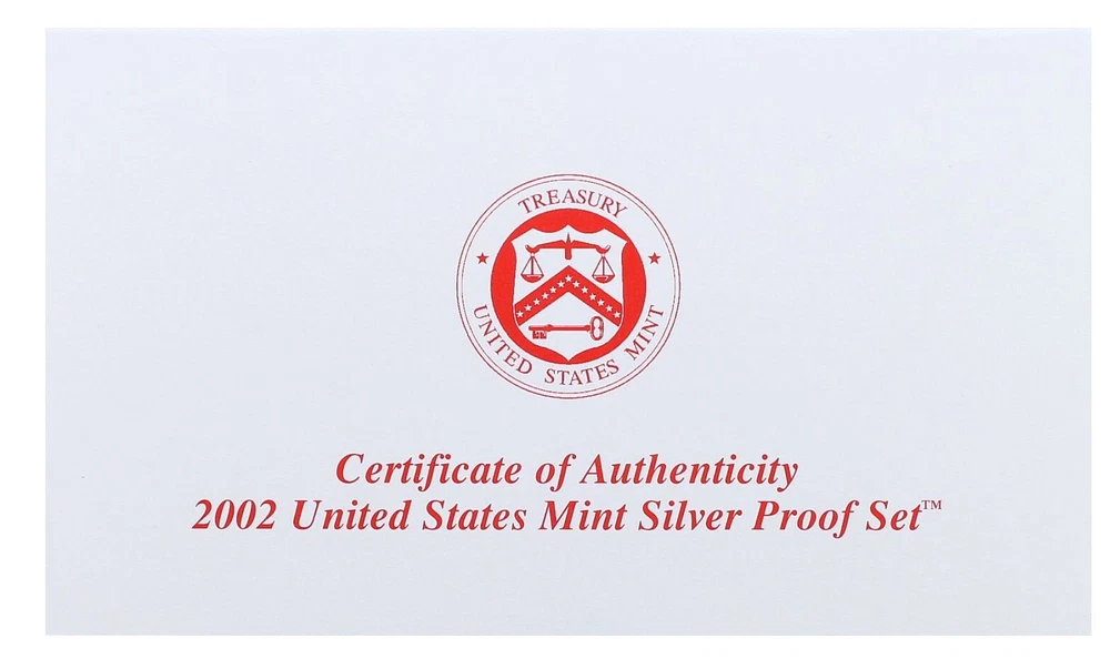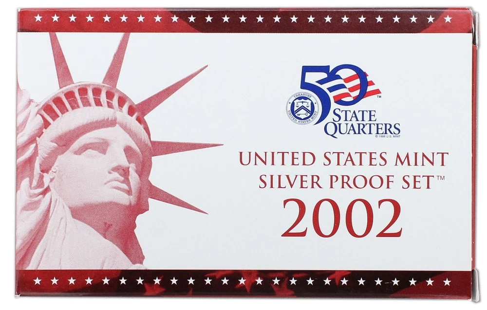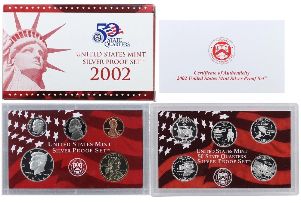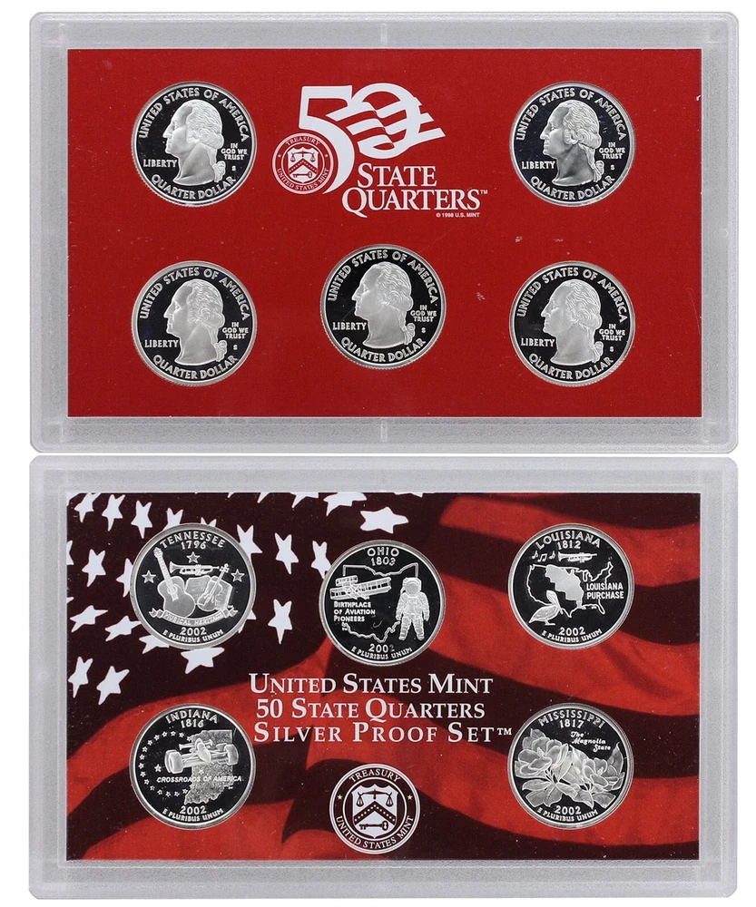 2002 United States Mint Silver Proof Set - 10 Coins - COA & OGP 90% Silver This 2002 U.S. Mint Silver Proof Set contains 10 proof condition silver coins. This 2002 Silver Proof set contains the Lincoln Cent, Jefferson Nickel, Roosevelt Dime, Kennedy Half-Dollar, Sacagawea Dollar and all five of the Washington Quarters minted for the 50 State Quarters Program in 2002. The 5 state quarters include Tennessee, Ohio, Louisiana, Indiana, and Mississippi and are minted in 90% silver, as are the dime, quarter, and half dollar. All 5 state quarters share the same Washington obverse. This 2002 U.S. Mint Silver Proof set comes in like new condition, sealed in two plastic display cases as packaged by the U.S. Mint, and includes the original Mint packaging box and Certificate of Authenticity.