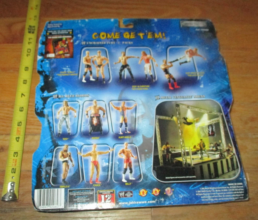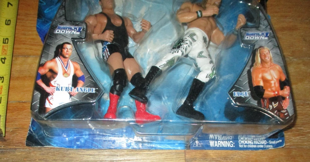 This item is an in package WWF WWE Jakks 2 figure set of former WWF WWE NWA TNA Impact and current AEW Wrestling Stars Edge who is now known as Adam Copeland in AEW and Olympian Kurt Angle. They are from the Unchained Fury Series. They were produced in 2002 by Jakks Pacific. They are on their sealed card but the there is some damage to the bottom corners and typical wear to the edges and corners as can be seen in the photos. Shipping outside of the United States will be extra. Please check out my other wrestling auctions and contact me with any questions or wrestling related item requests. Serious bidders only as negative comments will be placed if bids are not completed. Good Luck