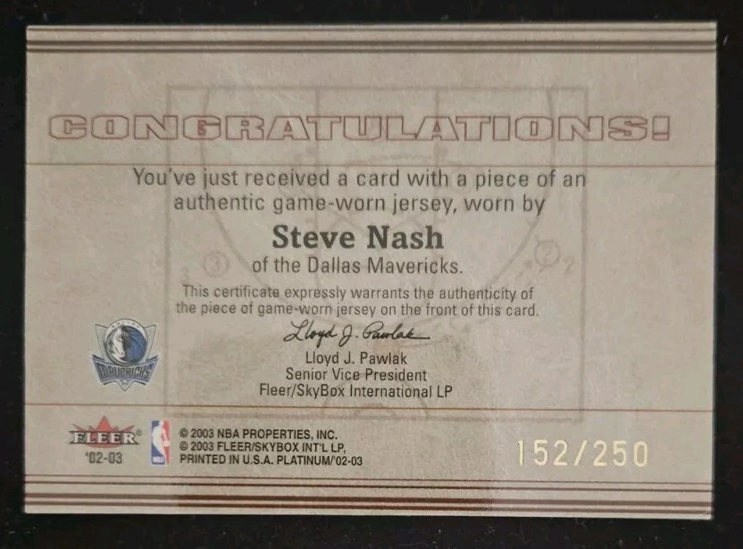 For avid basketball fans and collectors, this 2002-03 Fleer Platinum trading card featuring Steve Nash of the Dallas Mavericks is a must-have addition to your collection. This game-used card is part of the Inside the PlayBook insert set and is serial numbered to just 250, making it a rare find. In addition to its limited print run, this card also includes great features such as parallel/variety, insert, and memorabilia. It is perfect for those who admire Steve Nash's skills on the court or for those who are looking to add value to their collection. Don't miss out on this opportunity to own a piece of basketball history!
