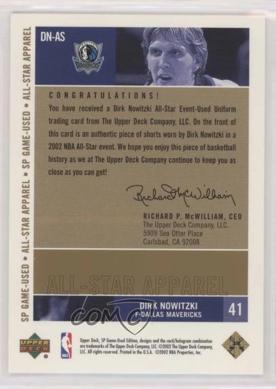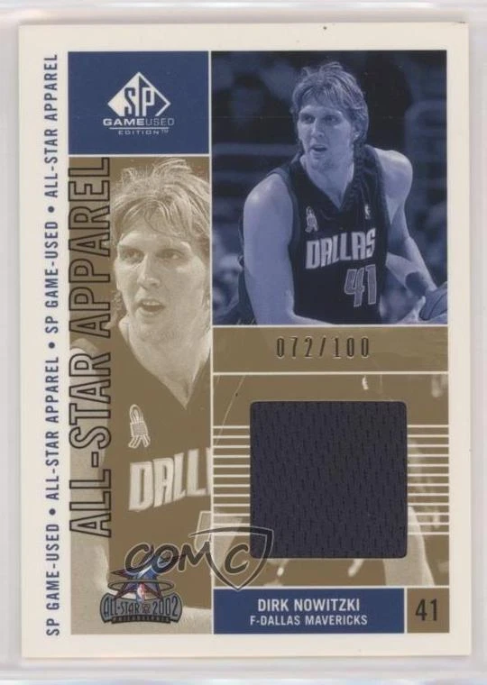 2002-03 SP Game Used Edition - All-Star Apparel - Gold #DN-AS Dirk Nowitzki Qty Made: 100 - Basketball Card - Featuring the Dallas Mavericks - Featuring Dirk Nowitzki Search for more: 2002-03 SP Game Used Edition Search for more: 2002-03 SP Game Used Edition - All-Star Apparel - Gold View all of our Listings Auctions Buy It Now About Us Located in the beautiful Pacific Northwest, COMC (Check Out My Cards) is the world's largest consignment service for trading card singles. More than 10,000 people have used our consignment service to list over 50 million trading cards. We currently house 20 million cards, each listed for sale with front and back images of the actual card. Find out how we can help you consign your items on eBay by contacting us through eBay messaging. COMC -- "The Safe & Easy Way to Buy & Sell" Representative Image - Select Specific Item above to see image of actual item Representative Image - Select Specific Item above to see image of actual item Raw Condition for Modern Cards Unless otherwise noted, raw modern cards are listed in Near Mint-Mint condition or better. A NM-MT card appears to be Mint at first glance, but upon closer inspection, may exhibit some of the following: minor print defects (e.g. roller marks, print line, dimple), minor scratches, slight edge wear, and slight corner wear. Centering is clearly visible in the images provided and does not factor into our condition assessment. Raw Condition for Vintage Cards Unless otherwise noted, raw vintage cards are listed in Excellent condition or better. An EX card may exhibit some of the following: minor rounding of corners, surface wear, print defects, light scratches, and slight edge wear/chipping. Centering is clearly visible in the images provided and does not factor into our condition assessment. Domestic Shipping Combined shipping for multiple items is available. To receive combined shipping, please ensure all desired items are in your eBay shopping cart before proceeding to checkout. eBay limits orders to 40 items per order. We automatically combine multiple orders placed on the same day. If you place multiple orders on the same day, please contact us to request a refund of applicable shipping costs. Signature confirmation may be required on invoices over $400. Raw cards are shipped in toploaders. International Shipping COMC offers eBay's International Shipping (EIS) for international orders under $2,500* (see country exceptions below). All duties and import fees are paid at checkout; in the rare event that there are additional import fees upon delivery, these are borne by the buyer. EIS packages route through a shipping hub in Erlanger, KY before shipping to their final destination. Please note that EIS does not allow for combined shipments. The shipping rates are determined by eBay and cannot be adjusted. *Maximum sale price exceptions: Colombia, Kuwait ($2,000); Taiwan ($1,539); Chile, Costa Rica, Guatemala, Honduras, Trinidad and Tobago ($1,000); Antigua and Barbuda, Aruba, Belize, Dominica, Grenada, Philippines, Saint Kitts and Nevis, Saint Lucia, Montserrat, Turks and Caicos Islands ($500); Dominican Republic, El Salvador ($200). Please request a shipping quote through eBay messaging for orders that exceed the maximum sale price supported by eBay's International Shipping. You will be responsible for all duties and import fees for international orders shipped outside the EIS. Raw cards are shipped in toploaders. Payment COMC does not accept offers on our cards through our eBay storefront. COMC utilizes eBay’s managed payments system. If you are experiencing difficulties making a payment, please contact eBay for assistance. Return Policy Returns are only accepted on the rare occasion the item is not as described. If you are making a return, please initiate the return process through eBay so a mailing label can be provided for you. Prior to listing, our expert team carefully assessed this item to represent it accurately. Please review the description and high-definition images prior to purchasing to ensure this item meets your satisfaction. We welcome you to contact us if you have further questions about this item. Trust and Integrity COMC carefully assesses each item consigned to us to prevent fraudulent items from entering the marketplace. If you believe an item offered on COMC may be fraudulent, please contact us with details so we can investigate the issue. Items we determine are outside our supported items policy may be removed. Last Modified: 11/30/2024 8:45:36 PM PDT