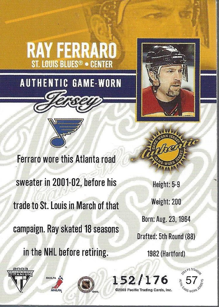 Welcome to our eBay store. Check out all our eBay items and check back often as we will be adding new cards daily. We ship each day so your order will be shipped promptly. We use top loaders or plastic boxes shipped in padded envelopes or cardboard boxes - whatever is appropriate. Pictures: Many of our pictures are stock photos. If you need to see a scan of the exact card you will receive, please email us before buying. If a card is serial numbered, we are not selling a specific serial number, unless the exact serial number is listed in the title. If our pictures does not match the description, the description is probably correct and photo incorrect - please let us know so we can get it fixed. USA shipping on singles is a flat fee - you can buy as many singles as you want for the one fee (does not include sets, boxes, or lots as these go by weight and your location). International shipping on singles is a FLAT fee - you can buy as many singles as you want for the one shipping fee (does not include sets, boxes, or lots as these go by weight and location). To get combined shipping, all cards must be paid for in 1 payment. You may have to wait to get a combined invoice if it did not combine automatically. We send out invoices each morning or ASAP upon request. Our retail store hours are 10am to 6pm, Central Time, Monday through Saturday. We answer your email during that time ASAP. 2002-03 Titanium Patches #57 Ray Ferraro Jersey /165 - NM-MT Front Back Sport: Hockey Set: 2002-03 Titanium Jerseys Patches Year: 2002 Item#: 57 Player: Ray Ferraro Attributes: Memorabilia, Serial Numbered Brand: Titanium Manufacturer: Pacific Trading Cards Grading Company: Raw Grade SetType: Parallel Item Condition: Near Mint/Mint 2014 Beckett Collectibles, LLC. All Rights Reserved Powered by: