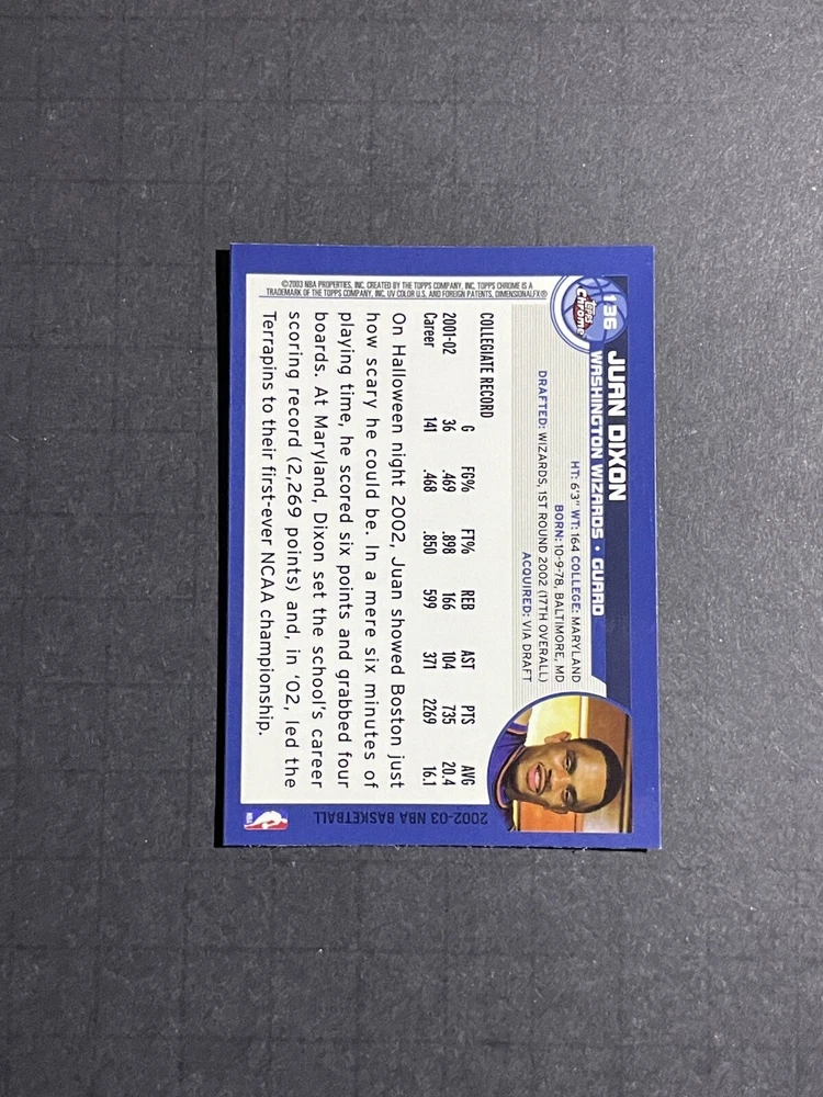 Manufacturer: Topps Sport: Basketball Card Number: 136 Type: Sports Trading Card Original/Licensed Reprint: Original League: National Basketball Association (NBA) Card Size: Standard Country/Region of Manufacture: United States Season: 2002-03 Player/Athlete: Juan Dixon Language: English Material: Card Stock Team: Atlanta Hawks, Boston Celtics, Brooklyn Nets, Charlotte Hornets, Dallas Mavericks, Denver Nuggets, Golden State Warriors, Houston Rockets, Los Angeles Clippers, Los Angeles Lakers, Memphis Grizzlies, Miami Heat, Milwaukee Bucks, Minnesota Timberwolves, New Jersey Nets, New Orleans Hornets, New York Knicks, Oklahoma City Thunder, Orlando Magic, Phoenix Suns, Portland Trail Blazers, Sacramento Kings, San Antonio Spurs, Seattle Supersonics, Toronto Raptors, Utah Jazz, Washington Bullets, Washington Wizards Autographed: No Features: Base Set, Rookie Set: 2002-03 Topps Chrome