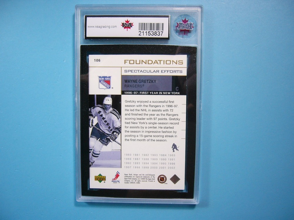 YOU ARE BIDDING ON A 2002/03 UPPER DECK FOUNDATIONS NHL HOCKEY CARD #106 WAYNE GRETZKY, NEW YORK RANGERS. FOUNDATIONS - SPECACULAR EFFORTS LIMITED EDITION #508/1250 CARD IS GRADED 10 BY KSA IN GEM MINT CONDITION. SEE SCANS FOR FURTHER CONDITION. GREAT COLOUR & GLOSS--A SUPER SHARP, CLEAN & ATTRACTIVE KEY CARD FROM THIS UPPER DECK HOCKEY SET!!! THANKS FOR LOOKING AND GOOD LUCK!!! ------------------------------------------------------------------------------------------------------------------------------------------- SHIPPING WITHIN CANADA IS $4.99. SHIPPING TO THE UNITED STATES IS $8.99 AND INCLUDES TRACKING & INSURANCE. SHIPPING INTERNATIONALLY (ANYWHERE ELSE) IS $25.00 AND INCLUDES TRACKING & INSURANCE. ITEM WILL BE CAREFULLY PACKAGED SO AS NOT TO GET DAMAGED DURING SHIPPING. IF YOU ARE IN CANADA AND WOULD LIKE SHIPPING WITH TRACKING & INSURANCE INCLUDED COST IS $12.99. PLEASE CONTACT US BEFORE PAYMENT IS MADE TO ADJUST THE INVOICE ACCORDINGLY. WE DO COMBINE SHIPPING ON MULTIPLE PURCHASES--ONLY $1.00 MORE FOR EACH ADDITIONAL SINGLE GRADED CARD OR ONLY 25 CENTS MORE FOR EACH ADDITIONAL SINGLE UNGRADED CARD. TAKE A LOOK AT OUR OTHER AUCTIONS AND SAVE ON SHIPPING!!!