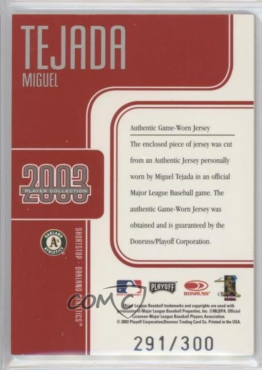 2003 Donruss Studio - Player Collection Jerseys #_MITE Miguel Tejada Qty Made: 300 - Baseball Card - Featuring the Oakland Athletics - Featuring Miguel Tejada Search for more: 2003 Donruss Studio Search for more: 2003 Donruss Studio - Player Collection Jerseys View all of our Listings Auctions Buy It Now About Us Located in the beautiful Pacific Northwest, COMC (Check Out My Cards) is the world's largest consignment service for trading card singles. More than 10,000 people have used our consignment service to list over 50 million trading cards. We currently house 20 million cards, each listed for sale with front and back images of the actual card. Find out how we can help you consign your items on eBay by contacting us through eBay messaging. COMC -- "The Safe & Easy Way to Buy & Sell" Representative Image - Select Specific Item above to see image of actual item Representative Image - Select Specific Item above to see image of actual item Raw Condition for Modern Cards Unless otherwise noted, raw modern cards are listed in Near Mint-Mint condition or better. A NM-MT card appears to be Mint at first glance, but upon closer inspection, may exhibit some of the following: minor print defects (e.g. roller marks, print line, dimple), minor scratches, slight edge wear, and slight corner wear. Centering is clearly visible in the images provided and does not factor into our condition assessment. Raw Condition for Vintage Cards Unless otherwise noted, raw vintage cards are listed in Excellent condition or better. An EX card may exhibit some of the following: minor rounding of corners, surface wear, print defects, light scratches, and slight edge wear/chipping. Centering is clearly visible in the images provided and does not factor into our condition assessment. Domestic Shipping Combined shipping for multiple items is available. To receive combined shipping, please ensure all desired items are in your eBay shopping cart before proceeding to checkout. eBay limits orders to 40 items per order. We automatically combine multiple orders placed on the same day. If you place multiple orders on the same day, please contact us to request a refund of applicable shipping costs. Signature confirmation may be required on invoices over $400. Raw cards are shipped in toploaders. International Shipping COMC offers eBay's International Shipping (EIS) for international orders under $2,500* (see country exceptions below). All duties and import fees are paid at checkout; in the rare event that there are additional import fees upon delivery, these are borne by the buyer. EIS packages route through a shipping hub in Erlanger, KY before shipping to their final destination. Please note that EIS does not allow for combined shipments. The shipping rates are determined by eBay and cannot be adjusted. *Maximum sale price exceptions: Colombia, Kuwait ($2,000); Taiwan ($1,539); Chile, Costa Rica, Guatemala, Honduras, Trinidad and Tobago ($1,000); Antigua and Barbuda, Aruba, Belize, Dominica, Grenada, Philippines, Saint Kitts and Nevis, Saint Lucia, Montserrat, Turks and Caicos Islands ($500); Dominican Republic, El Salvador ($200). Please request a shipping quote through eBay messaging for orders that exceed the maximum sale price supported by eBay's International Shipping. You will be responsible for all duties and import fees for international orders shipped outside the EIS. Raw cards are shipped in toploaders. Payment COMC does not accept offers on our cards through our eBay storefront. COMC utilizes eBay’s managed payments system. If you are experiencing difficulties making a payment, please contact eBay for assistance. Return Policy Returns are only accepted on the rare occasion the item is not as described. If you are making a return, please initiate the return process through eBay so a mailing label can be provided for you. Prior to listing, our expert team carefully assessed this item to represent it accurately. Please review the description and high-definition images prior to purchasing to ensure this item meets your satisfaction. We welcome you to contact us if you have further questions about this item. Trust and Integrity COMC carefully assesses each item consigned to us to prevent fraudulent items from entering the marketplace. If you believe an item offered on COMC may be fraudulent, please contact us with details so we can investigate the issue. Items we determine are outside our supported items policy may be removed. Last Modified: 12/31/2024 8:33:43 PM PDT