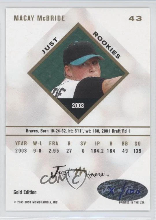 2003 Just Minors Just Rookies - [Base] - Gold Autographs #43 Macay McBride Qty Made: 100 - Baseball Card - Featuring Macay McBride Search for more: 2003 Just Minors Just Rookies Search for more: 2003 Just Minors Just Rookies - [Base] - Gold Autographs View all of our Listings Auctions Buy It Now About Us Located in the beautiful Pacific Northwest, COMC (Check Out My Cards) is the world's largest consignment service for trading card singles. More than 10,000 people have used our consignment service to list over 50 million trading cards. We currently house 20 million cards, each listed for sale with front and back images of the actual card. Find out how we can help you consign your items on eBay by contacting us through eBay messaging. COMC -- "The Safe & Easy Way to Buy & Sell" Representative Image - Select Specific Item above to see image of actual item Representative Image - Select Specific Item above to see image of actual item Raw Condition for Modern Cards Unless otherwise noted, raw modern cards are listed in Near Mint-Mint condition or better. A NM-MT card appears to be Mint at first glance, but upon closer inspection, may exhibit some of the following: minor print defects (e.g. roller marks, print line, dimple), minor scratches, slight edge wear, and slight corner wear. Centering is clearly visible in the images provided and does not factor into our condition assessment. Raw Condition for Vintage Cards Unless otherwise noted, raw vintage cards are listed in Excellent condition or better. An EX card may exhibit some of the following: minor rounding of corners, surface wear, print defects, light scratches, and slight edge wear/chipping. Centering is clearly visible in the images provided and does not factor into our condition assessment. Domestic Shipping Combined shipping for multiple items is available. To receive combined shipping, please ensure all desired items are in your eBay shopping cart before proceeding to checkout. eBay limits orders to 40 items per order. We automatically combine multiple orders placed on the same day. If you place multiple orders on the same day, please contact us to request a refund of applicable shipping costs. Signature confirmation may be required on invoices over $400. Raw cards are shipped in toploaders. International Shipping COMC offers eBay's International Shipping (EIS) for international orders under $2,500* (see country exceptions below). All duties and import fees are paid at checkout; in the rare event that there are additional import fees upon delivery, these are borne by the buyer. EIS packages route through a shipping hub in Erlanger, KY before shipping to their final destination. Please note that EIS does not allow for combined shipments. The shipping rates are determined by eBay and cannot be adjusted. *Maximum sale price exceptions: Colombia, Kuwait ($2,000); Taiwan ($1,539); Chile, Costa Rica, Guatemala, Honduras, Trinidad and Tobago ($1,000); Antigua and Barbuda, Aruba, Belize, Dominica, Grenada, Philippines, Saint Kitts and Nevis, Saint Lucia, Montserrat, Turks and Caicos Islands ($500); Dominican Republic, El Salvador ($200). Please request a shipping quote through eBay messaging for orders that exceed the maximum sale price supported by eBay's International Shipping. You will be responsible for all duties and import fees for international orders shipped outside the EIS. Raw cards are shipped in toploaders. Payment COMC does not accept offers on our cards through our eBay storefront. COMC utilizes eBay’s managed payments system. If you are experiencing difficulties making a payment, please contact eBay for assistance. Return Policy Returns are only accepted on the rare occasion the item is not as described. If you are making a return, please initiate the return process through eBay so a mailing label can be provided for you. Prior to listing, our expert team carefully assessed this item to represent it accurately. Please review the description and high-definition images prior to purchasing to ensure this item meets your satisfaction. We welcome you to contact us if you have further questions about this item. Trust and Integrity COMC carefully assesses each item consigned to us to prevent fraudulent items from entering the marketplace. If you believe an item offered on COMC may be fraudulent, please contact us with details so we can investigate the issue. Items we determine are outside our supported items policy may be removed. Last Modified: 11/30/2024 6:50:32 PM PDT