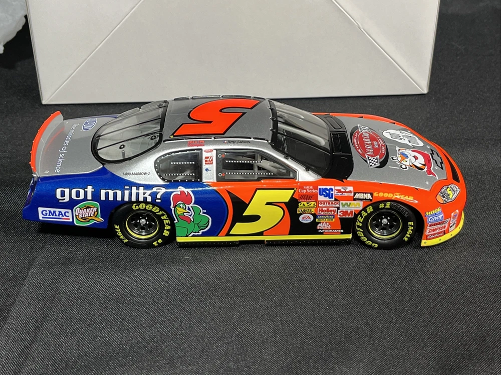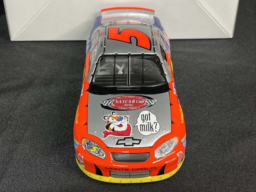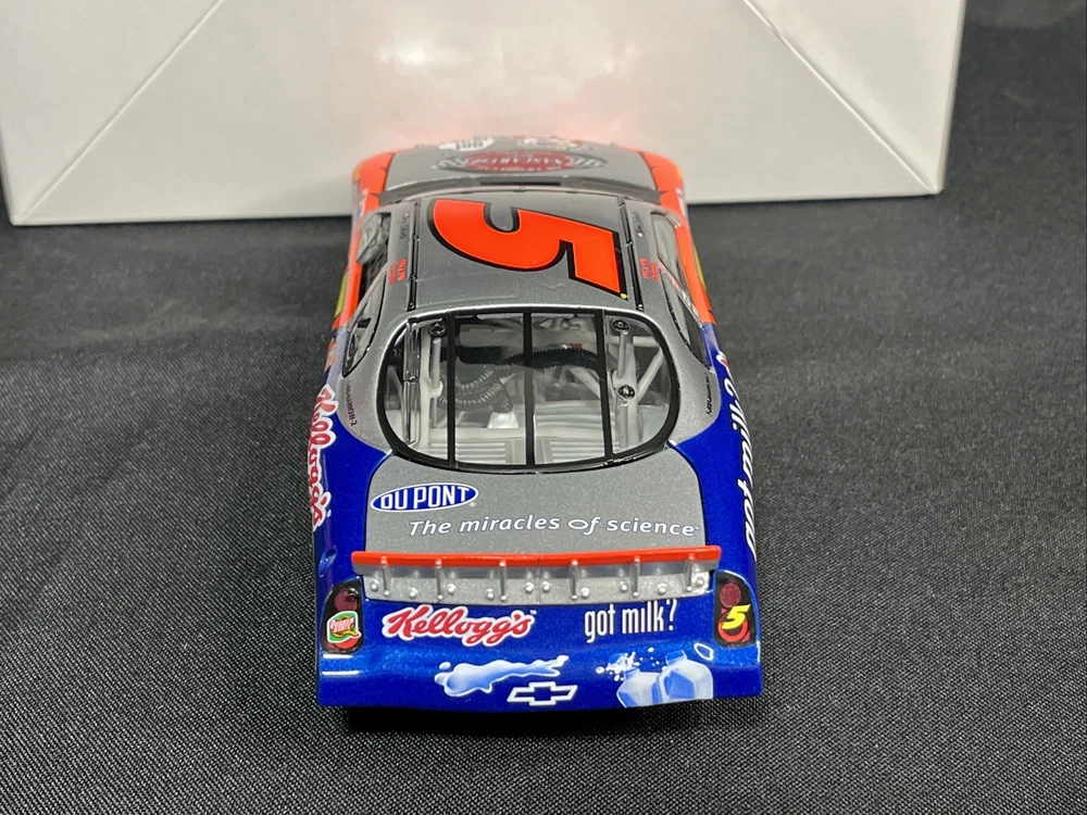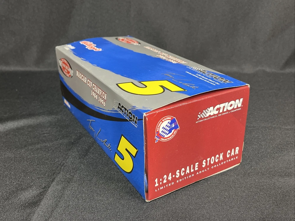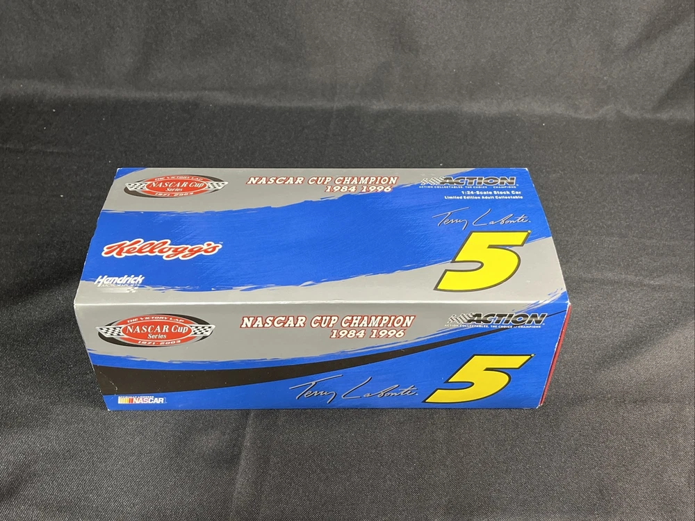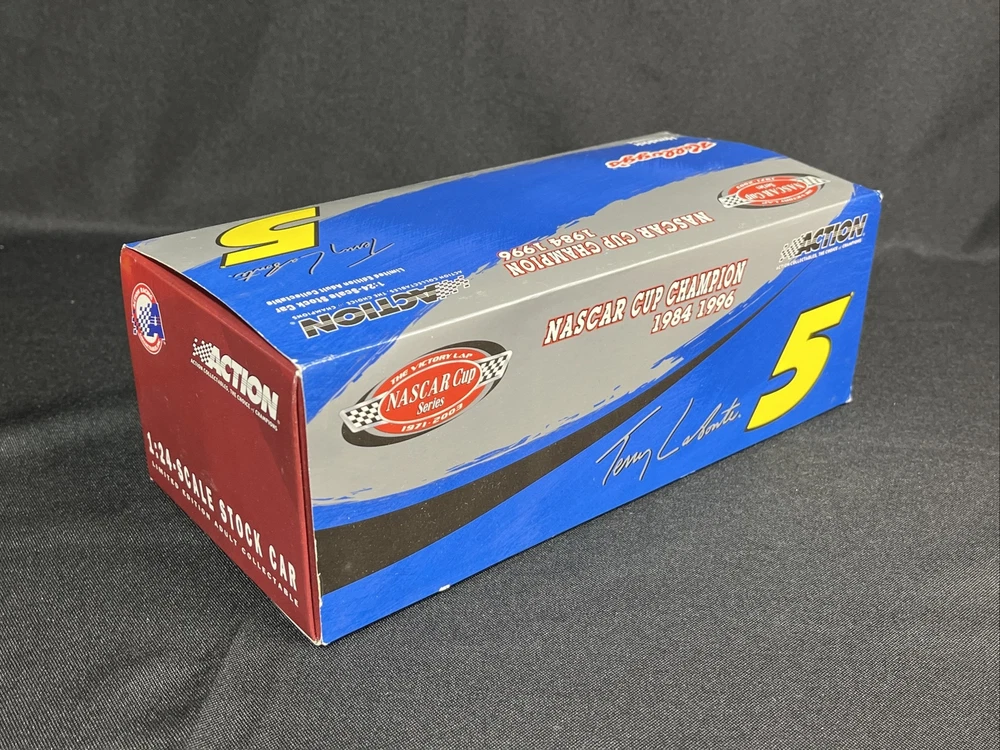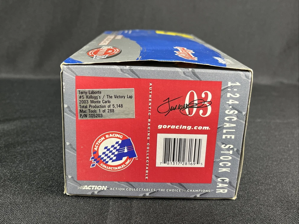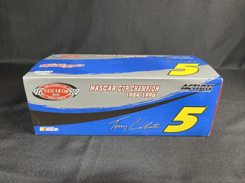 This is a 1:24 scale 2003 NASCAR diecast model of Terry Labonte's #5 Chevrolet NASCAR racecar. It features a multi-color design with Kellogg's The Victory Lap branding. The diecast material makes it a limited edition collectible item associated with the Action brand and NASCAR organization. Box shows minor signs of wear. SB