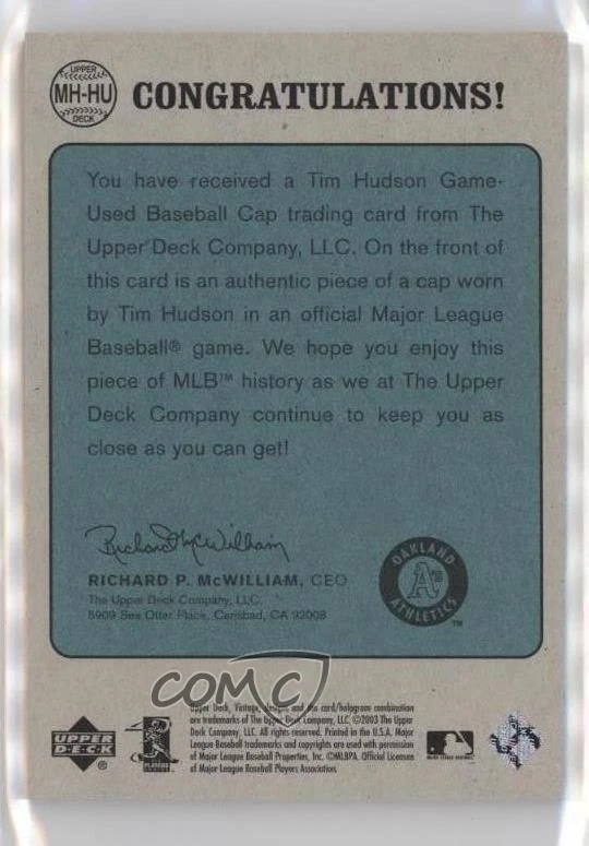 2003 Upper Deck Vintage - Men with Hats #MH-HU Tim Hudson - Baseball Card - Featuring the Oakland Athletics - Featuring Tim Hudson Search for more: 2003 Upper Deck Vintage Search for more: 2003 Upper Deck Vintage - Men with Hats View all of our Listings Auctions Buy It Now About Us Located in the beautiful Pacific Northwest, COMC (Check Out My Cards) is the world's largest consignment service for trading card singles. More than 10,000 people have used our consignment service to list over 50 million trading cards. We currently house 20 million cards, each listed for sale with front and back images of the actual card. Find out how we can help you consign your items on eBay by contacting us through eBay messaging. COMC -- "The Safe & Easy Way to Buy & Sell" Representative Image - Select Specific Item above to see image of actual item Representative Image - Select Specific Item above to see image of actual item Raw Condition for Modern Cards Unless otherwise noted, raw modern cards are listed in Near Mint-Mint condition or better. A NM-MT card appears to be Mint at first glance, but upon closer inspection, may exhibit some of the following: minor print defects (e.g. roller marks, print line, dimple), minor scratches, slight edge wear, and slight corner wear. Centering is clearly visible in the images provided and does not factor into our condition assessment. Raw Condition for Vintage Cards Unless otherwise noted, raw vintage cards are listed in Excellent condition or better. An EX card may exhibit some of the following: minor rounding of corners, surface wear, print defects, light scratches, and slight edge wear/chipping. Centering is clearly visible in the images provided and does not factor into our condition assessment. Domestic Shipping Combined shipping for multiple items is available. To receive combined shipping, please ensure all desired items are in your eBay shopping cart before proceeding to checkout. eBay limits orders to 40 items per order. We automatically combine multiple orders placed on the same day. If you place multiple orders on the same day, please contact us to request a refund of applicable shipping costs. Signature confirmation may be required on invoices over $400. Raw cards are shipped in toploaders. International Shipping COMC offers eBay's International Shipping (EIS) for international orders under $2,500* (see country exceptions below). All duties and import fees are paid at checkout; in the rare event that there are additional import fees upon delivery, these are borne by the buyer. EIS packages route through a shipping hub in Erlanger, KY before shipping to their final destination. Please note that EIS does not allow for combined shipments. The shipping rates are determined by eBay and cannot be adjusted. *Maximum sale price exceptions: Colombia, Kuwait ($2,000); Taiwan ($1,539); Chile, Costa Rica, Guatemala, Honduras, Trinidad and Tobago ($1,000); Antigua and Barbuda, Aruba, Belize, Dominica, Grenada, Philippines, Saint Kitts and Nevis, Saint Lucia, Montserrat, Turks and Caicos Islands ($500); Dominican Republic, El Salvador ($200). Please request a shipping quote through eBay messaging for orders that exceed the maximum sale price supported by eBay's International Shipping. You will be responsible for all duties and import fees for international orders shipped outside the EIS. Raw cards are shipped in toploaders. Payment COMC does not accept offers on our cards through our eBay storefront. COMC utilizes eBay’s managed payments system. If you are experiencing difficulties making a payment, please contact eBay for assistance. Return Policy Returns are only accepted on the rare occasion the item is not as described. If you are making a return, please initiate the return process through eBay so a mailing label can be provided for you. Prior to listing, our expert team carefully assessed this item to represent it accurately. Please review the description and high-definition images prior to purchasing to ensure this item meets your satisfaction. We welcome you to contact us if you have further questions about this item. Trust and Integrity COMC carefully assesses each item consigned to us to prevent fraudulent items from entering the marketplace. If you believe an item offered on COMC may be fraudulent, please contact us with details so we can investigate the issue. Items we determine are outside our supported items policy may be removed. Last Modified: 12/30/2024 7:03:46 PM PDT