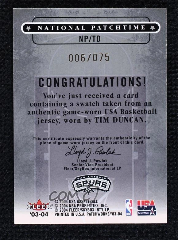 2003-04 Fleer Patchworks - National Patchtime - USA Patch #NP/TD Tim Duncan Qty Made: 75 - Basketball Card - Featuring the Team USA (Olympics) - Featuring Tim Duncan Search for more: 2003-04 Fleer Patchworks Search for more: 2003-04 Fleer Patchworks - National Patchtime - USA Patch View all of our Listings Auctions Buy It Now About Us Located in the beautiful Pacific Northwest, COMC (Check Out My Cards) is the world's largest consignment service for trading card singles. More than 10,000 people have used our consignment service to list over 50 million trading cards. We currently house 20 million cards, each listed for sale with front and back images of the actual card. Find out how we can help you consign your items on eBay by contacting us through eBay messaging. COMC -- "The Safe & Easy Way to Buy & Sell" Representative Image - Select Specific Item above to see image of actual item Representative Image - Select Specific Item above to see image of actual item Raw Condition for Modern Cards Unless otherwise noted, raw modern cards are listed in Near Mint-Mint condition or better. A NM-MT card appears to be Mint at first glance, but upon closer inspection, may exhibit some of the following: minor print defects (e.g. roller marks, print line, dimple), minor scratches, slight edge wear, and slight corner wear. Centering is clearly visible in the images provided and does not factor into our condition assessment. Raw Condition for Vintage Cards Unless otherwise noted, raw vintage cards are listed in Excellent condition or better. An EX card may exhibit some of the following: minor rounding of corners, surface wear, print defects, light scratches, and slight edge wear/chipping. Centering is clearly visible in the images provided and does not factor into our condition assessment. Domestic Shipping Combined shipping for multiple items is available. To receive combined shipping, please ensure all desired items are in your eBay shopping cart before proceeding to checkout. eBay limits orders to 40 items per order. We automatically combine multiple orders placed on the same day. If you place multiple orders on the same day, please contact us to request a refund of applicable shipping costs. Signature confirmation may be required on invoices over $400. Raw cards are shipped in toploaders. International Shipping COMC offers eBay's International Shipping (EIS) for international orders under $2,500* (see country exceptions below). All duties and import fees are paid at checkout; in the rare event that there are additional import fees upon delivery, these are borne by the buyer. EIS packages route through a shipping hub in Erlanger, KY before shipping to their final destination. Please note that EIS does not allow for combined shipments. The shipping rates are determined by eBay and cannot be adjusted. *Maximum sale price exceptions: Colombia, Kuwait ($2,000); Taiwan ($1,539); Chile, Costa Rica, Guatemala, Honduras, Trinidad and Tobago ($1,000); Antigua and Barbuda, Aruba, Belize, Dominica, Grenada, Philippines, Saint Kitts and Nevis, Saint Lucia, Montserrat, Turks and Caicos Islands ($500); Dominican Republic, El Salvador ($200). Please request a shipping quote through eBay messaging for orders that exceed the maximum sale price supported by eBay's International Shipping. You will be responsible for all duties and import fees for international orders shipped outside the EIS. Raw cards are shipped in toploaders. Payment COMC does not accept offers on our cards through our eBay storefront. COMC utilizes eBay’s managed payments system. If you are experiencing difficulties making a payment, please contact eBay for assistance. Return Policy Returns are only accepted on the rare occasion the item is not as described. If you are making a return, please initiate the return process through eBay so a mailing label can be provided for you. Prior to listing, our expert team carefully assessed this item to represent it accurately. Please review the description and high-definition images prior to purchasing to ensure this item meets your satisfaction. We welcome you to contact us if you have further questions about this item. Trust and Integrity COMC carefully assesses each item consigned to us to prevent fraudulent items from entering the marketplace. If you believe an item offered on COMC may be fraudulent, please contact us with details so we can investigate the issue. Items we determine are outside our supported items policy may be removed. Last Modified: 1/17/2025 7:22:40 AM PDT