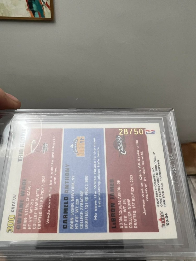 The product is a highly sought-after 2003-04 Fleer Tradition basketball trading card featuring star players Carmelo Anthony, Dwyane Wade, and LeBron James. Crystal /50!!!!! This particular card is numbered 300 in the set and is a Crystal parallel variety manufactured by Fleer/SkyBox International. As a rare collectible from the 2003 season, this card holds significant value for basketball card enthusiasts and fans of these iconic players. It is a special addition to any sports memorabilia collection and a must-have for fans of the NBA legends featured on the card.