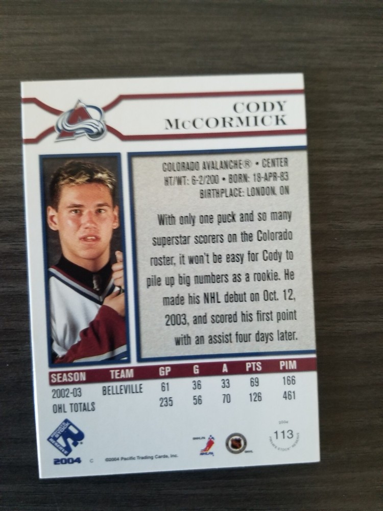 Player: Cody McCormick Card Attributes: Rookie, SerialNumbered Original/Reprint: Original Sport: Ice Hockey Card Manufacturer: Pacific Trading Cards Features: Rookie Parallel/Variety: Retail Athlete: Cody McCormick Year Manufactured: 2003 Manufacturer: Pacific Trading Cards Season: 2003-04 Player/Athlete: Cody McCormick Set: 2003-04 Pacific Private Stock Reserve - [Base] - Retail Year: 2003-04 Card Name: Cody McCormick Product: Single-Parallel Team: Colorado Avalanche Franchise: N/A Card Number: 113 Type: Sports Trading Card