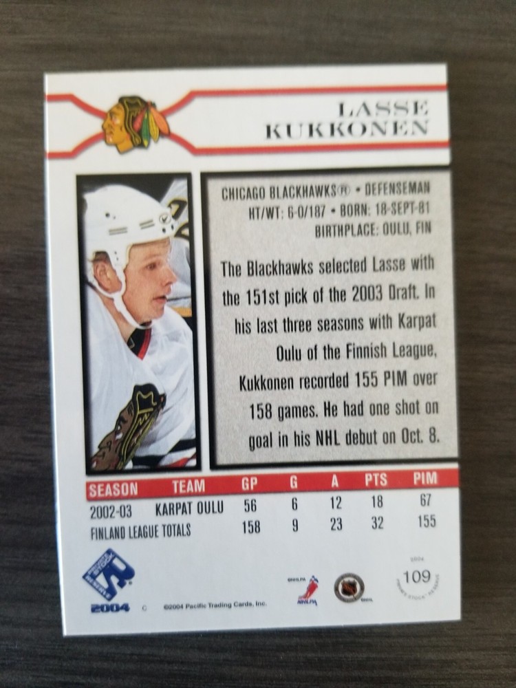 Team: Chicago Blackhawks Parallel/Variety: Retail Manufacturer: Pacific Trading Cards Card Manufacturer: Pacific Trading Cards Athlete: Lasse Kukkonen Set: 2003-04 Pacific Private Stock Reserve - [Base] - Retail Sport: Ice Hockey Card Number: 109 Card Attributes: Rookie, SerialNumbered Card Name: Lasse Kukkonen Original/Reprint: Original Franchise: N/A Year Manufactured: 2003 Season: 2003-04 Type: Sports Trading Card Player/Athlete: Lasse Kukkonen Product: Single-Parallel Year: 2003-04 Player: Lasse Kukkonen Features: Rookie