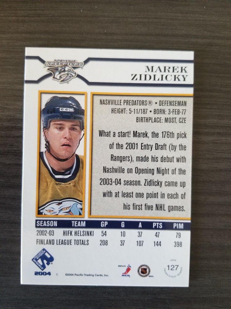 Athlete: Marek Zidlicky Franchise: N/A Year Manufactured: 2003 Card Name: Marek Zidlicky Type: Sports Trading Card Card Number: 127 Player/Athlete: Marek Zidlicky Team: Nashville Predators Manufacturer: Pacific Trading Cards Year: 2003-04 Features: Rookie Player: Marek Zidlicky Card Attributes: Rookie, SerialNumbered Set: 2003-04 Pacific Private Stock Reserve - [Base] - Retail Parallel/Variety: Retail Original/Reprint: Original Product: Single-Parallel Season: 2003-04 Card Manufacturer: Pacific Trading Cards Sport: Ice Hockey