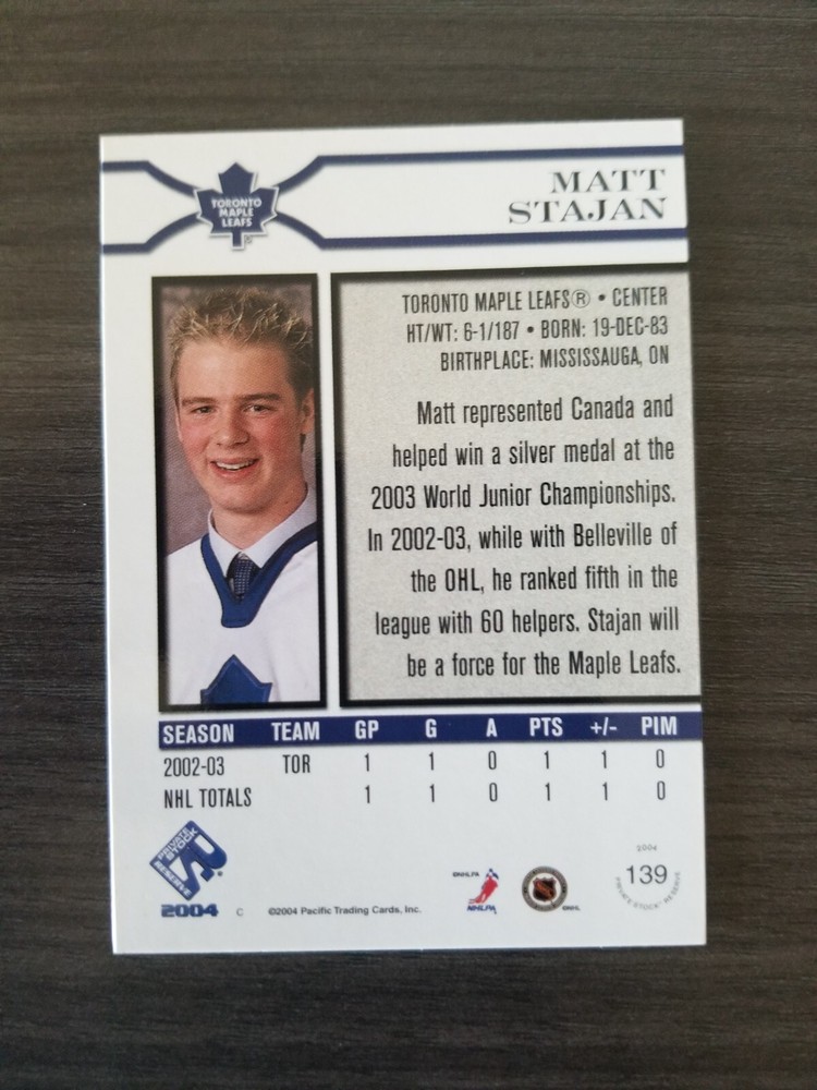 Card Name: Matt Stajan Parallel/Variety: Retail Features: Rookie Product: Single-Parallel Original/Reprint: Original Team: Toronto Maple Leafs Type: Sports Trading Card Card Manufacturer: Pacific Trading Cards Set: 2003-04 Pacific Private Stock Reserve - [Base] - Retail Season: 2003-04 Card Number: 139 Year Manufactured: 2003 Player: Matt Stajan Sport: Ice Hockey Franchise: N/A Card Attributes: Rookie, SerialNumbered Year: 2003-04 Athlete: Matt Stajan Manufacturer: Pacific Trading Cards Player/Athlete: Matt Stajan