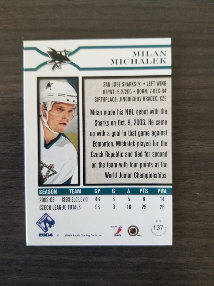 Set: 2003-04 Pacific Private Stock Reserve - [Base] - Retail Card Name: Milan Michalek Sport: Ice Hockey Manufacturer: Pacific Trading Cards Type: Sports Trading Card Card Number: 137 Year: 2003-04 Card Manufacturer: Pacific Trading Cards Player: Milan Michalek Franchise: N/A Athlete: Milan Michalek Product: Single-Parallel Original/Reprint: Original Player/Athlete: Milan Michalek Parallel/Variety: Retail Year Manufactured: 2003 Card Attributes: Rookie, SerialNumbered Team: San Jose Sharks Season: 2003-04 Features: Rookie
