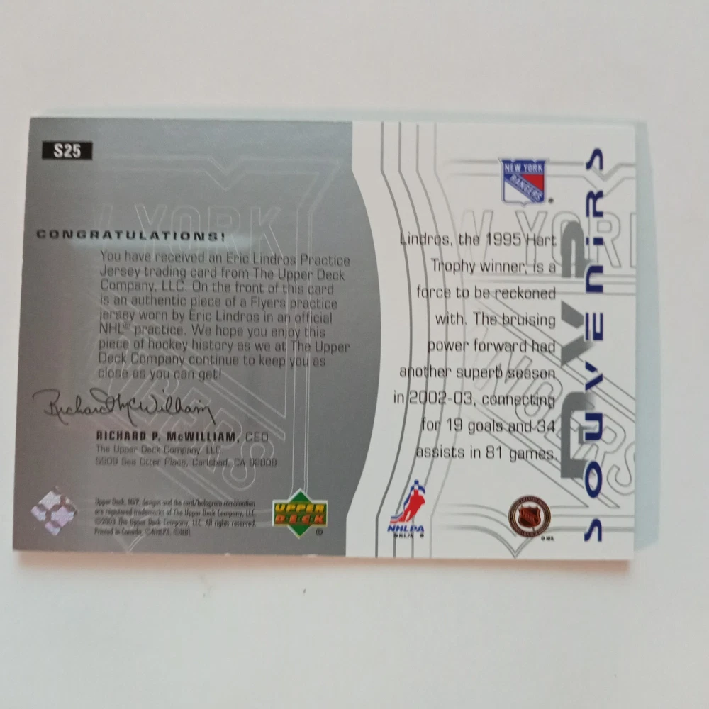 This is a rare and valuable sports trading card featuring Eric Lindros, a former player for the New York Rangers. The card is from the 2003-04 Upper Deck MVP set and includes a patch and memorabilia insert. It is a must-have for any fan or collector of hockey cards. The card is ungraded and has not been autographed. The card is part of the National Hockey League (NHL) and is perfect for those who love ice hockey. It is a great addition to any sports trading card collection. The card number is S25 and it is from the 2003-04 season. Get your hands on this rare Eric Lindros card today!
