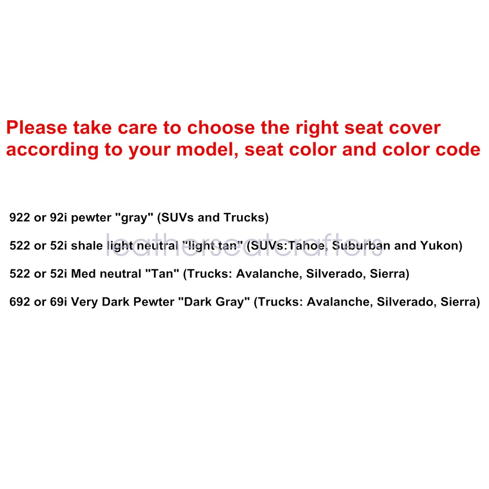 Front Bottom & Top Seat Cover For 2003-2006 Chevy Avalanche Silverado Gray 692 Details Replacement For 2003-2007 Chevrolet/GMC Silverado, Avalanche, Sierra Driver & Passenger Bottom & Back Seat Covers & Armrest Cover Dark Gray 692,69i NOTE: Material is Microfiber Leather,NOT Leather! Direct Replacement Fits Front Driver & Passenger Side Actual Replacement Cover. NOT A SLIP ON or PULLOVER. You will remove the old cover & then install the New Cover. Fitment: 2003 2004 2005 2006 2007 Chevy/GMC Silverado, Avalanche, Sierra 2003 Chevy Avalanche, Silverado & GMC Sierra 1500 2500 3500 HD. 2004 Chevy Avalanche, Silverado & GMC Sierra 1500 2500 3500 HD. 2005 Chevy Avalanche, Silverado & GMC Sierra 1500 2500 3500 HD. 2006 Chevy Avalanche, Silverado & GMC Sierra 1500 2500 3500 HD. 2007 Chevy Avalanche, Silverado & GMC Sierra 1500 2500 3500 HD Classic. And MORE Model Specification: Name: Driver & Passenger Side Leather Seat Cover & Armrest Cover Color: Dark Gray Color Code: " 692 or 69i or 69v " Located in your Glove Box Sticke Material: Microfiber Leather,NOT Leather! Heated Seats: Fits Heated Seats and Non Heated Seats Power Seats: Fits Power Seats and Non Power Seats Vehicles Inner Liner: 1/2 & 1/4 Inch Padding like Packing Included: Driver & Passenger Replacement Leather Seat Cover (2x Bottom Seat Cover & 2x Back Seat Cover) Driver & Passenger Replacement Armrest Cover Tips: This Driver & Passenger seat cover & Armrest Cover, built to factory specs with Quality Microfiber Leather to match the Interior of your vehicle! Our product is exactly the same as your existing cover and guaranteed to fit perfectly on your seat foam Pad. Any wrinkles seen in the pictures is from being in a box and guaranteed to disappear once installed Correctly. Please note this item is a replacement, not a slip on or pull over. (Foam pad and frame are not included). The boxing/skirting is vinyl sewn onto foam like . Note: Actual Replacement Cover. NOT A SLIP ON or PULLOVER. You will remove the old cover & then install the New Cover. Communication is the best way to solve the problem. If you have any problems after purchasing, please contact us in time, before opening return or case. Shipping policy: Payment: Returns: About us: Shipping policy: 1.Orders are usually shipped within 24 hours after your payment(except weekends & official holidays). You can log on to eBay to check your logistics tracking number. 2.Please make sure to provide us with correct,precise and detailed shipping address before purchase, and cannot change it once purchased. Payment: PayPal payment accepted only.Please purchase and pay for the item through the eBay. Returns: 1.If any item is defective upon receipt or do not work, please contact us for the condition,we will provide a solution for such cases. 2.Return is accepted within 30 days after the buyer receiving the item. About us: 1.Thanks for purchasing in our store,if you have any questions, please contact us immediately. We will provide you with the high quality service. 2.If you are satisfied with our products, please give us a positive feedback. On Dec 21, 2024 at 16:06:41 PST, seller added the following information: