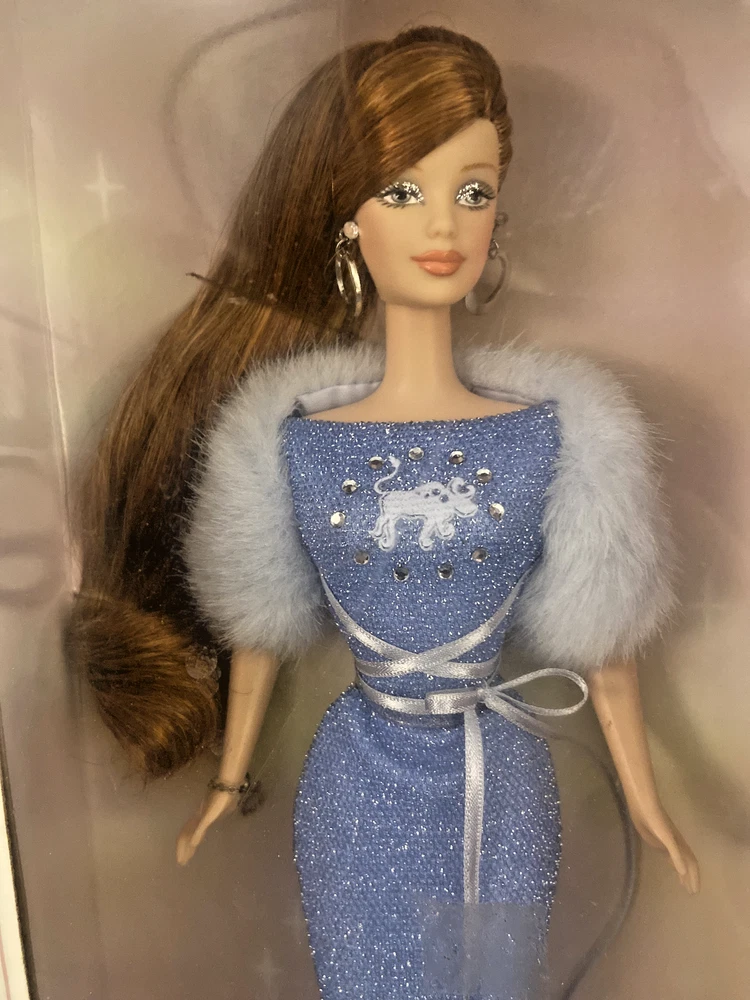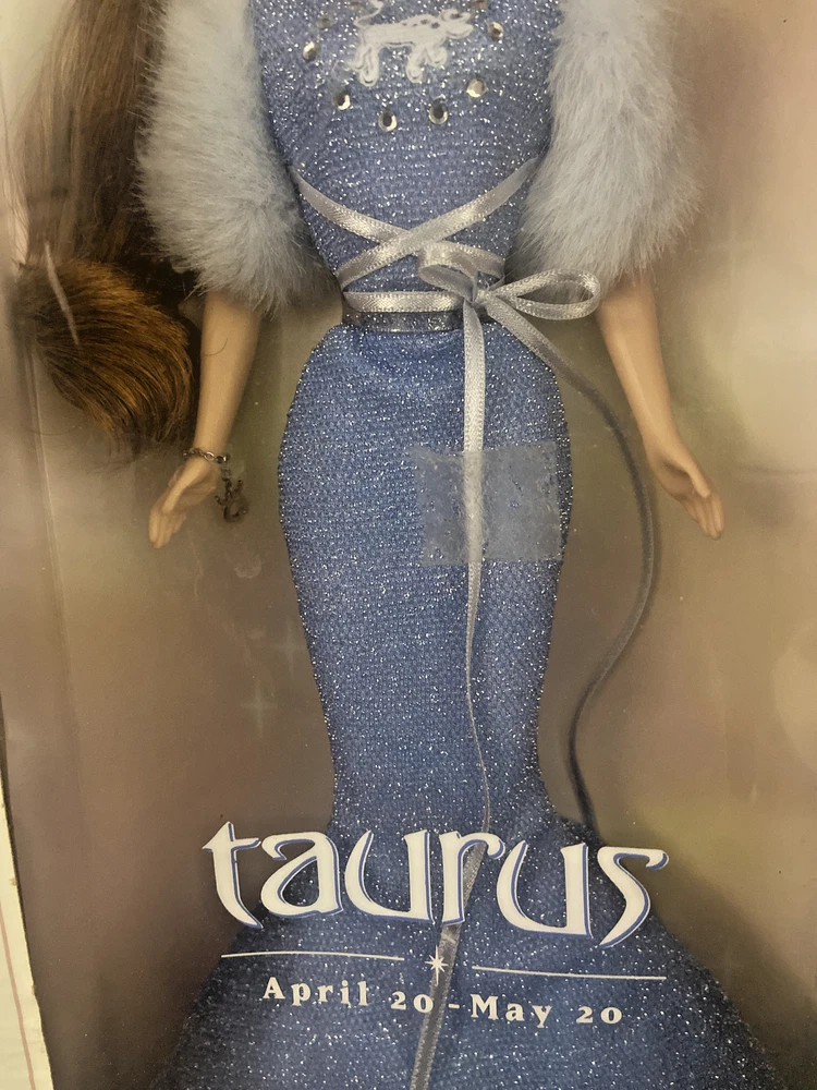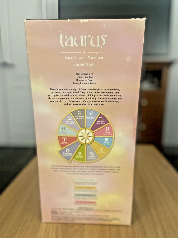 This is a vintage Barbie collector doll from 2004 in the April Zodiac series, representing the Taurus sign. It comes in its original packaging, part of the Pink Label collection. The box has some damage, but the doll itself is in good condition, still attached in the box. Please note that the box may be damaged, but the doll is in good condition for display or play. I tem is being Sold as is , Please review all pictures and descriptions before bidding. Doll Is New In box (still attached) , box has some damage / marks from storage. Pictures above show damaged areas on box from storage.