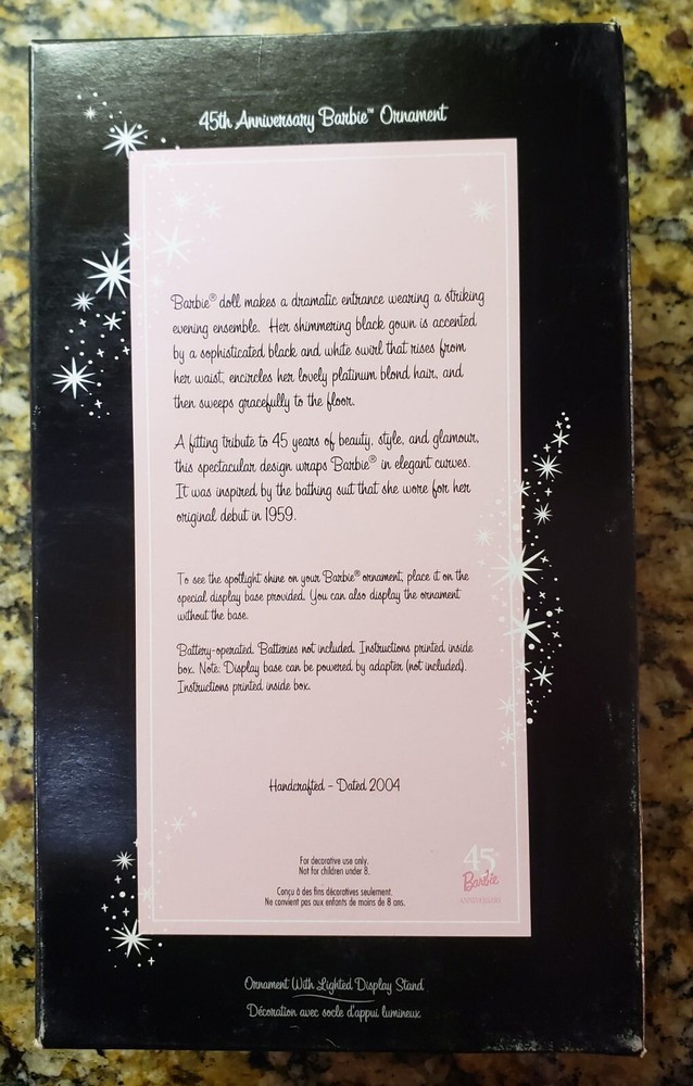Celebrate a milestone with the 2004 Hallmark Keepsake 45th Anniversary Barbie Ornament, a must-have for collectors and enthusiasts. This charming piece features a beautifully crafted Barbie figure, perfect for commemorating anniversary celebrations. It comes with a lighted stand that adds a touch of sparkle and warmth to your holiday display, creating a romantic and festive atmosphere. As part of Hallmark's treasured Ornaments collection, this item stands out with its intricate design and attention to detail. The ornament captures the essence of the iconic Barbie character and is a timeless addition to any collection. Whether for decoration or as a thoughtful gift, this Barbie ornament is sure to be a delightful addition to your celebratory decor. The lighted stand is battery operated, batteries not included. Barbie collectors, be sure to check out my other listings. I combine shipping for multiple purchases.