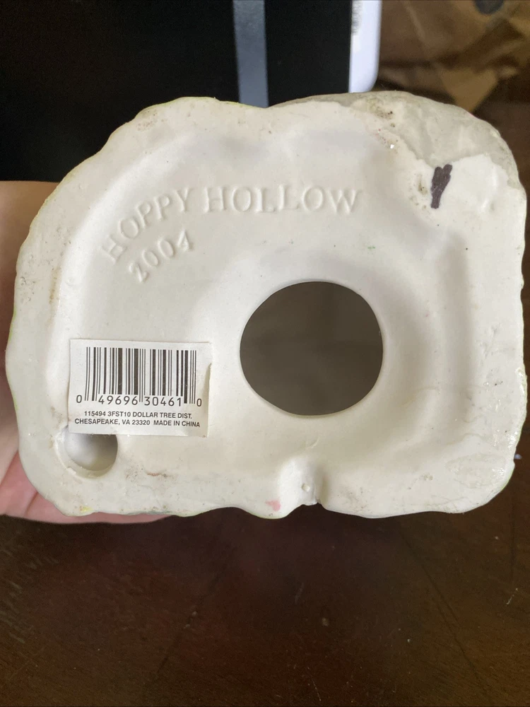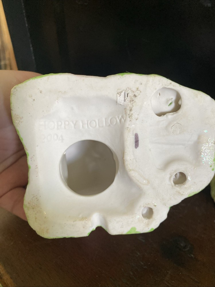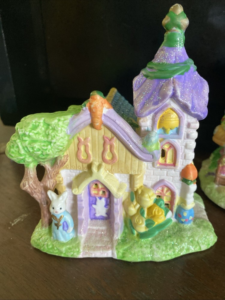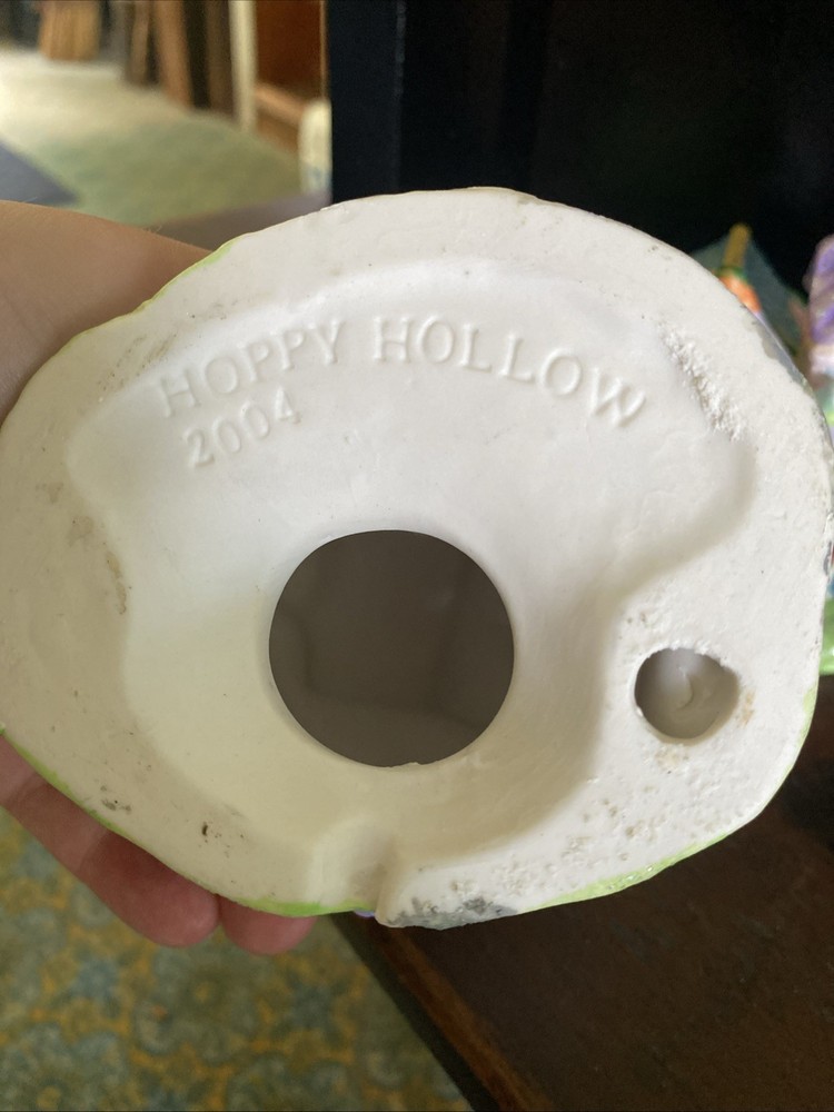 The Hoppy Hollow 2004 Easter Bunny Village features a charming church, bunny's boutique, and flower shop, all designed in a pastel color scheme with a floral pattern. Made of ceramic and porcelain, this collectible set from the Easter Bunny Village collection by Hoppy Hollow is perfect for celebrating spring and the Easter season. The delightful village scene is ideal for displaying in any shop or room, adding a whimsical touch of Easter joy to your home decor.