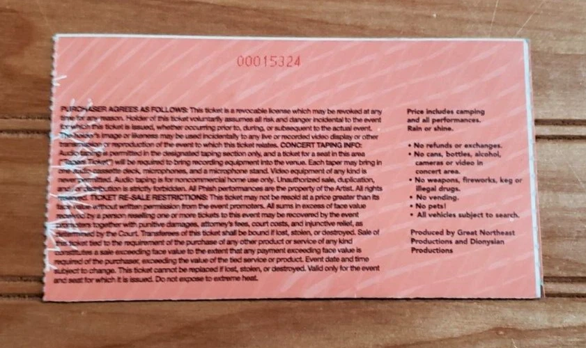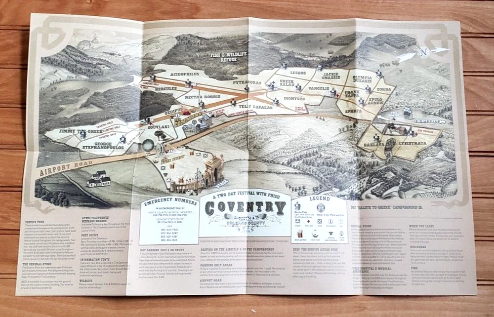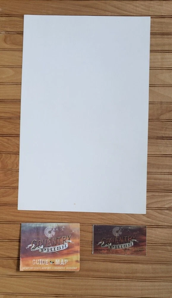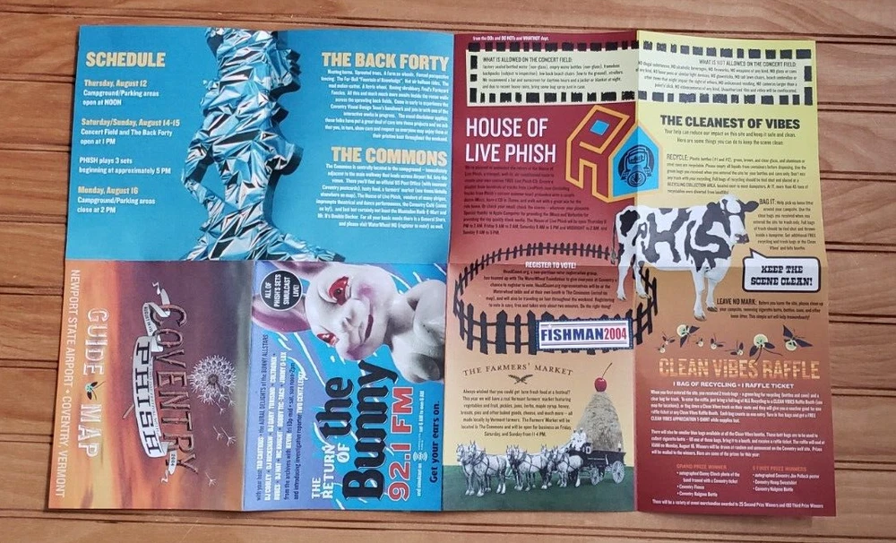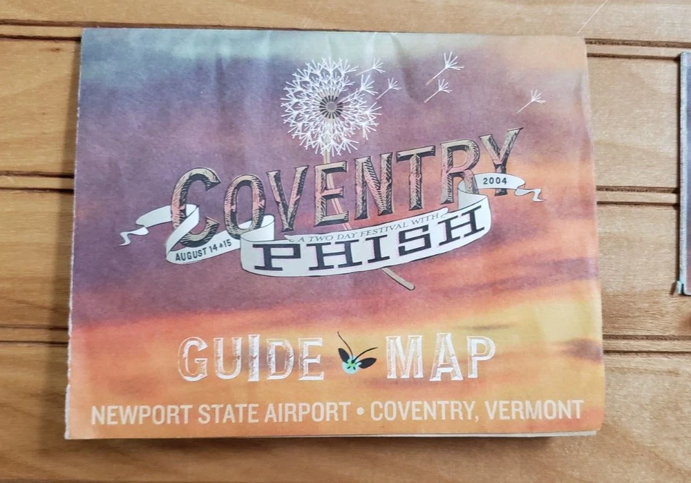 I have this rare poster of Coventry Festival in Vermont 8-14/15-2004. It is an Amy Milligan work. It comes with a mail order ticket stub and a festival map Saddest final "Curtain"...this festival was just hard for everyone on so many levels. The mud was fn crazy...lost shoes. Last shows...forever for all we knew. Trying to find your car along some random road after. SET 1 : Walls of the Cave > Runaway Jim -> Gotta Jibboo , You Enjoy Myself > Sample in a Jar > Axilla > Poor Heart > Run Like an Antelope [1] , Fire SET 2 : AC/DC Bag -> 46 Days > Halley's Comet -> Ya Mar , David Bowie , Character Zero SET 3 : Twist -> The Wedge , Stash > Free , Guyute , Drowned > Friday ENCORE : Harry Hood [2] [1] Tom Marshall on vocals. [2] With Trey banter. At the end of Hood, the band stopped playing allowing the audience to sing the "You can feel good, good, good about Hood" refrain. This was the first show of the Coventry festival and was simulcast in movie theaters nationwide. During YEM, the band gave away their trampolines. Throughout the duration of the set, groups of fans held the trampolines above their heads, and some fans jumped on the trampolines as well. Tom Marshall sang the lyrics to Antelope. Trey teased Waves in Halley's Comet. Before Bowie, Trey told a story of the summer he spent living in a cabin in the Northeast Kingdom where he remembered writing several songs, including Bowie. Trey explained that Bowie was an attempt to see “how far can you push it in the harmonic and rhythmic language and still have people dancing.” During Hood, Trey (speaking in rhythm) noted that because there were a row of rocks separating the band from the crowd, they were feeling a certain level of disconnect (particularly when Mike plays a "sexy" note). To remedy the situation, Trey and Mike ventured down onto the rocks for the duration of the song. At the end of Hood, the band stopped playing, allowing the audience to sing the “You can feel good, good, good about Hood” refrain. SET 1 : Mike's Song > I Am Hydrogen > Weekapaug Groove , Anything But Me , Reba , Carini > Chalk Dust Torture -> Possum > Wolfman's Brother [1] > Taste SET 2 : Down with Disease [2] > Wading in the Velvet Sea [3] , Glide , Split Open and Melt -> Ghost SET 3 : Fast Enough for You , Seven Below [4] -> Simple > Piper -> Cool Jerk [5] -> The Dickie Scotland Song [6] , Wilson > Slave to the Traffic Light ENCORE : The Curtain With [7] [1] Explanation from Trey as to the history of the song; also features Trey's mom, Mike's mom and John Paluska on "sexy bump". [2] Unfinished. [3] Page and Trey break down. [4] "Seven Below" shouted by all band members sporadically during the jam. [5] Phish debut; lyrics changed to honor Mark "Bruno" Bradley. [6] Debut; lyrics referenced Hadden Hipsley and Dickie Scotland [7] Jam segment stopped and restarted in correct key. This was the second show of the Coventry festival and was the presumed “Final Show.” When Trey made his “break-up” announcement the preceding May, he indicated that Coventry would be the final Phish shows. In reality, this turned out to be the final public show for over four and a half years. This show was simulcast in movie theaters nationwide. Before Anything But Me, Trey announced that, for the first time in 21 years, he was nervous performing a Phish show. During Wolfman’s, Trey revealed that the Wolfman’s Brother is, in fact, Fish (as well as the fact that he handed the phone to his friend Liz Durfee). Also, during Wolfman’s, Trey and Mike invited their mothers onstage (and later John Paluska) to do the “sexy bump” dance. Disease was unfinished and featured Trey briefly playing his guitar with a glow stick. Both Page and Trey broke down during an especially emotional Velvet Sea. After a thoroughly botched Glide, all four band members offered words of thanks to the fans for their continued support and dedication and brief reflections on their twenty years together. Trey then stated that what they really needed to do was “blow off some fucking steam” before starting up Melt. There was an enormous glow stick war during Ghost featuring hundreds, if not thousands, of orange glow sticks. This version of Seven Below saw all of the band members sporadically shouting “Seven Below” throughout the jam. The Phish debut of Cool Jerk contained alternate lyrics honoring monitor mixer, Mark “Bruno” Bradley. The Dickie Scotland Song was spontaneously created and included lyrics in honor of production manager, Hadden Hipsley, and tour accountant, Richard Glasgow (a.k.a. Dickie Scotland). Before Wilson, Trey asked the crowd to sing to another of their friends “for the last time.” There was a fireworks display between the end of the third set and the encore. Before the encore, while explaining the origins of The Curtain, Trey jokingly announced that the entire Chicago Symphony and the Twyla Tharp Dance Troupe were going to perform Gamehendge. Trey explained that they chose The Curtain With as the last song to bring them full circle, because, not only was it one of the first Phish songs he wrote, but he wrote it in a cabin one town over from Coventry. Trey stopped and restarted the jam segment of the Curtain With, because they were in the wrong key or, as he explained, ”Since we are going to be bringing ourselves back in time, we may as well do it in the correct key.” There was no P.A. music after the