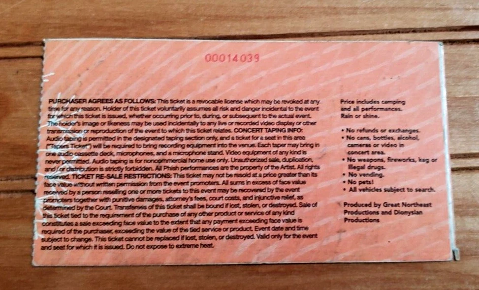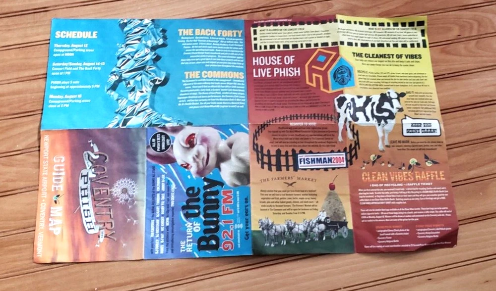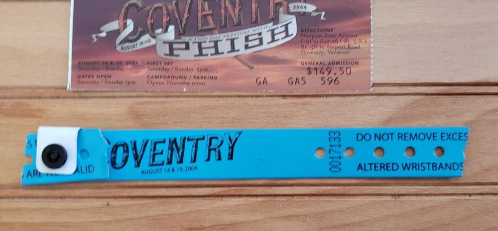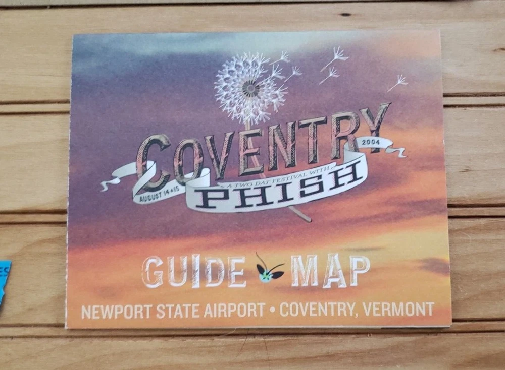 I have this rare poster of Coventry Festival in Vermont 8-14/15-2004. It is a Andrew Findley work. It comes with a wristband, mail order ticket stub and a festival map Saddest final "Curtain"...this festival was just hard for everyone on so many levels. The mud was fn crazy...lost shoes. Last shows...forever for all we knew. Trying to find your car along some random road after. SET 1 : Walls of the Cave > Runaway Jim -> Gotta Jibboo , You Enjoy Myself > Sample in a Jar > Axilla > Poor Heart > Run Like an Antelope [1] , Fire SET 2 : AC/DC Bag -> 46 Days > Halley's Comet -> Ya Mar , David Bowie , Character Zero SET 3 : Twist -> The Wedge , Stash > Free , Guyute , Drowned > Friday ENCORE : Harry Hood [2] [1] Tom Marshall on vocals. [2] With Trey banter. At the end of Hood, the band stopped playing allowing the audience to sing the "You can feel good, good, good about Hood" refrain. This was the first show of the Coventry festival and was simulcast in movie theaters nationwide. During YEM, the band gave away their trampolines. Throughout the duration of the set, groups of fans held the trampolines above their heads, and some fans jumped on the trampolines as well. Tom Marshall sang the lyrics to Antelope. Trey teased Waves in Halley's Comet. Before Bowie, Trey told a story of the summer he spent living in a cabin in the Northeast Kingdom where he remembered writing several songs, including Bowie. Trey explained that Bowie was an attempt to see “how far can you push it in the harmonic and rhythmic language and still have people dancing.” During Hood, Trey (speaking in rhythm) noted that because there were a row of rocks separating the band from the crowd, they were feeling a certain level of disconnect (particularly when Mike plays a "sexy" note). To remedy the situation, Trey and Mike ventured down onto the rocks for the duration of the song. At the end of Hood, the band stopped playing, allowing the audience to sing the “You can feel good, good, good about Hood” refrain. SET 1 : Mike's Song > I Am Hydrogen > Weekapaug Groove , Anything But Me , Reba , Carini > Chalk Dust Torture -> Possum > Wolfman's Brother [1] > Taste SET 2 : Down with Disease [2] > Wading in the Velvet Sea [3] , Glide , Split Open and Melt -> Ghost SET 3 : Fast Enough for You , Seven Below [4] -> Simple > Piper -> Cool Jerk [5] -> The Dickie Scotland Song [6] , Wilson > Slave to the Traffic Light ENCORE : The Curtain With [7] [1] Explanation from Trey as to the history of the song; also features Trey's mom, Mike's mom and John Paluska on "sexy bump". [2] Unfinished. [3] Page and Trey break down. [4] "Seven Below" shouted by all band members sporadically during the jam. [5] Phish debut; lyrics changed to honor Mark "Bruno" Bradley. [6] Debut; lyrics referenced Hadden Hipsley and Dickie Scotland [7] Jam segment stopped and restarted in correct key. This was the second show of the Coventry festival and was the presumed “Final Show.” When Trey made his “break-up” announcement the preceding May, he indicated that Coventry would be the final Phish shows. In reality, this turned out to be the final public show for over four and a half years. This show was simulcast in movie theaters nationwide. Before Anything But Me, Trey announced that, for the first time in 21 years, he was nervous performing a Phish show. During Wolfman’s, Trey revealed that the Wolfman’s Brother is, in fact, Fish (as well as the fact that he handed the phone to his friend Liz Durfee). Also, during Wolfman’s, Trey and Mike invited their mothers onstage (and later John Paluska) to do the “sexy bump” dance. Disease was unfinished and featured Trey briefly playing his guitar with a glow stick. Both Page and Trey broke down during an especially emotional Velvet Sea. After a thoroughly botched Glide, all four band members offered words of thanks to the fans for their continued support and dedication and brief reflections on their twenty years together. Trey then stated that what they really needed to do was “blow off some fucking steam” before starting up Melt. There was an enormous glow stick war during Ghost featuring hundreds, if not thousands, of orange glow sticks. This version of Seven Below saw all of the band members sporadically shouting “Seven Below” throughout the jam. The Phish debut of Cool Jerk contained alternate lyrics honoring monitor mixer, Mark “Bruno” Bradley. The Dickie Scotland Song was spontaneously created and included lyrics in honor of production manager, Hadden Hipsley, and tour accountant, Richard Glasgow (a.k.a. Dickie Scotland). Before Wilson, Trey asked the crowd to sing to another of their friends “for the last time.” There was a fireworks display between the end of the third set and the encore. Before the encore, while explaining the origins of The Curtain, Trey jokingly announced that the entire Chicago Symphony and the Twyla Tharp Dance Troupe were going to perform Gamehendge. Trey explained that they chose The Curtain With as the last song to bring them full circle, because, not only was it one of the first Phish songs he wrote, but he wrote it in a cabin one town over from Coventry. Trey stopped and restarted the jam segment of the Curtain With, because they were in the wrong key or, as he explained, ”Since we are going to be bringing ourselves back in time, we may as well do it in the correct key.” There was no P.A. music after the