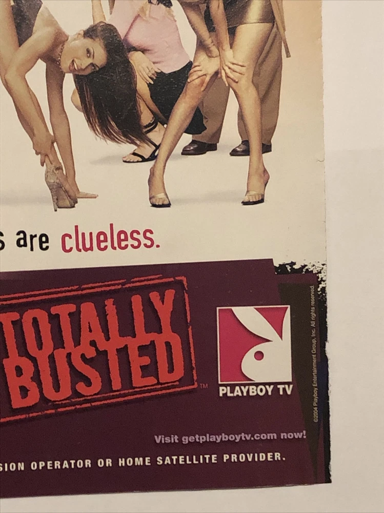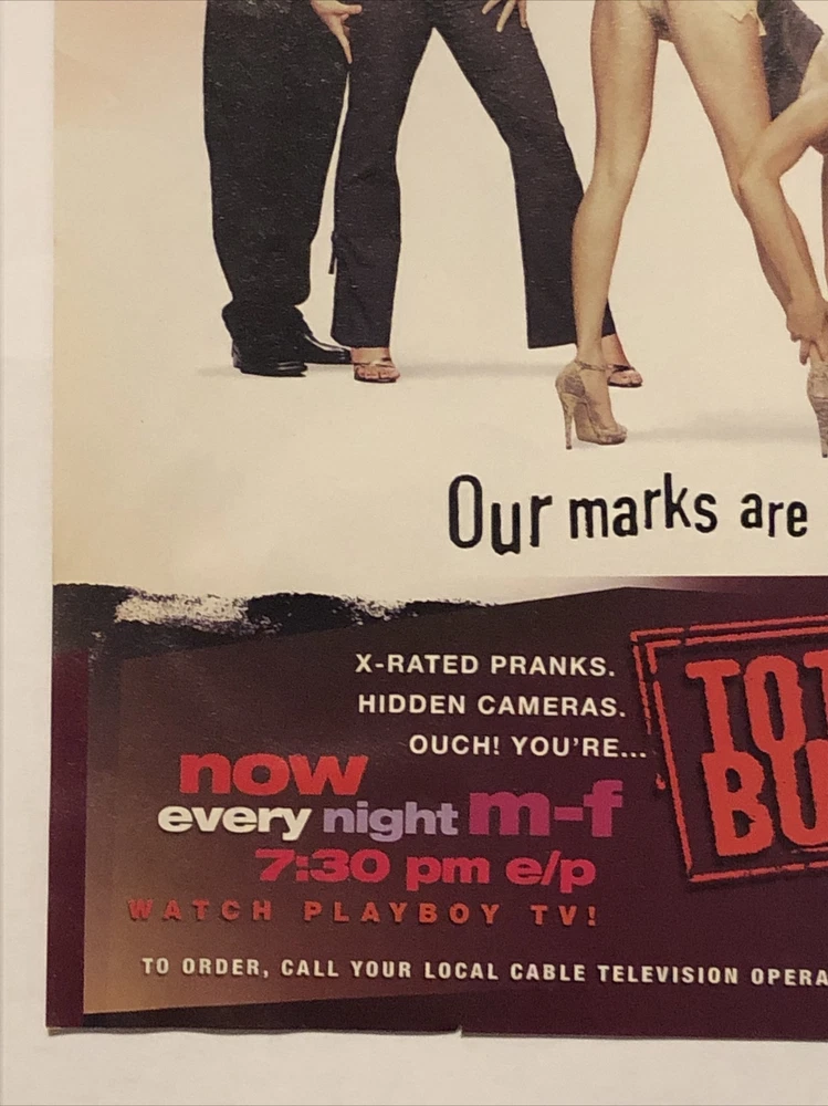 Take a look at this rare 2004 Playboy TV Show Totally Busted Dirty Trick Squad PRINT AD X-Rated Pranks. This vintage original piece is a must-have for any television or entertainment memorabilia collector. Made in the United States, this ad showcases the humorous and outrageous pranks featured on the show. Add it to your collection today and enjoy the nostalgia of a time when this show was at its peak. Don't miss out on the opportunity to own a piece of pop culture history. Original approximate 8”x11” vintage magazine print ad.