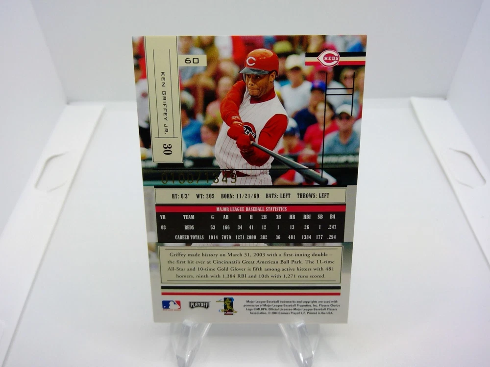 This is an amazing 2004 Playoff Absolute Memorabilia sports trading card featuring Ken Griffey Jr. of the Cincinnati Reds. The card is numbered out of 1349 and is in standard size. It was manufactured by Donruss/Playoff in the United States and is part of the Major League (MLB) league. This card is a must-have for any baseball fan and collector. It is an absolute memorabilia card with features like serial numbering, making it a rare and valuable addition to your collection. The card is in English language and has the card number 60, representing the 2004 season. Get your hands on this fantastic card and add it to your sports trading card collection today. 100/1349.