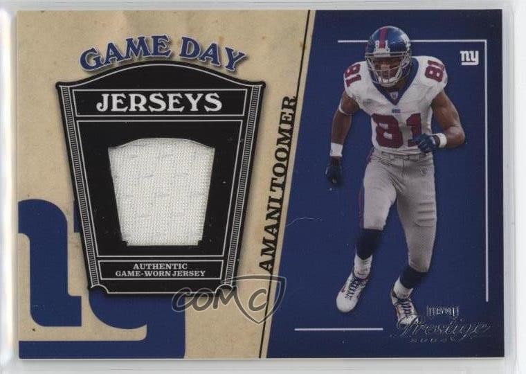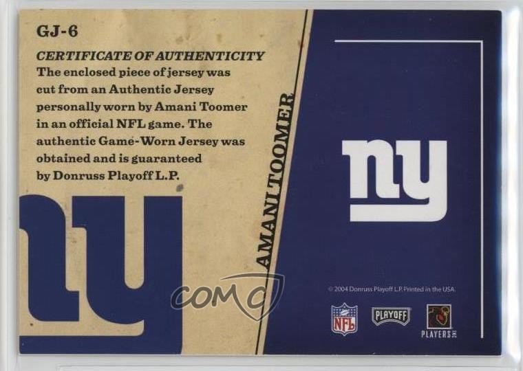 2004 Playoff Prestige - Game Day Jerseys #GJ-6 Amani Toomer - Football Card - Featuring the New York Giants - Featuring Amani Toomer Search for more: 2004 Playoff Prestige Search for more: 2004 Playoff Prestige - Game Day Jerseys View all of our Listings Auctions Buy It Now About Us Located in the beautiful Pacific Northwest, COMC (Check Out My Cards) is the world's largest consignment service for trading card singles. More than 10,000 people have used our consignment service to list over 50 million trading cards. Find out how we can help you consign your items on eBay by contacting us through eBay messaging. COMC -- "The Safe & Easy Way to Buy & Sell" Representative Image - Select Specific Item above to see image of actual item Representative Image - Select Specific Item above to see image of actual item Raw Condition for Modern Cards Unless otherwise noted, raw modern cards are listed in Near Mint-Mint condition or better. A NM-MT card appears to be Mint at first glance, but upon closer inspection, may exhibit some of the following: minor print defects (e.g. roller marks, print line, dimple), minor scratches, slight edge wear, and slight corner wear. Centering is clearly visible in the images provided and does not factor into our condition assessment. Raw Condition for Vintage Cards Unless otherwise noted, raw vintage cards are listed in Excellent condition or better. An EX card may exhibit some of the following: minor rounding of corners, surface wear, print defects, light scratches, and slight edge wear/chipping. Centering is clearly visible in the images provided and does not factor into our condition assessment. Domestic Shipping Combined shipping for multiple items is available. To receive combined shipping, please ensure all desired items are in your eBay shopping cart before proceeding to checkout. eBay limits orders to 40 items per order. We automatically combine multiple orders placed on the same day. If you place multiple orders on the same day, please contact us to request a refund of applicable shipping costs. Signature confirmation may be required on invoices over $400. All cards are protected and shipped securely. International Shipping COMC offers eBay's International Shipping (EIS) for international orders under $2,500* (see country exceptions below). All duties and import fees are paid at checkout; in the rare event that there are additional import fees upon delivery, these are borne by the buyer. EIS packages route through a shipping hub in Erlanger, KY before shipping to their final destination. Please note that EIS does not allow for combined shipments. The shipping rates are determined by eBay and cannot be adjusted. *Maximum sale price exceptions: Colombia, Kuwait ($2,000); Taiwan ($1,539); Chile, Costa Rica, Guatemala, Honduras, Trinidad and Tobago ($1,000); Antigua and Barbuda, Aruba, Belize, Dominica, Grenada, Philippines, Saint Kitts and Nevis, Saint Lucia, Montserrat, Turks and Caicos Islands ($500); Dominican Republic, El Salvador ($200). Please request a shipping quote through eBay messaging for orders that exceed the maximum sale price supported by eBay's International Shipping. You will be responsible for all duties and import fees for international orders shipped outside the EIS. All cards are protected and shipped securely. Payment COMC does not accept offers on our cards through our eBay storefront. COMC utilizes eBay’s managed payments system. If you are experiencing difficulties making a payment, please contact eBay for assistance. Return Policy Returns are only accepted on the rare occasion the item is not as described. If you are making a return, please initiate the return process through eBay so a mailing label can be provided for you. Prior to listing, our expert team carefully assessed this item to represent it accurately. Please review the description and high-definition images prior to purchasing to ensure this item meets your satisfaction. We welcome you to contact us if you have further questions about this item. Trust and Integrity COMC carefully assesses each item consigned to us to prevent fraudulent items from entering the marketplace. If you believe an item offered on COMC may be fraudulent, please contact us with details so we can investigate the issue. Items we determine are outside our supported items policy may be removed. Last Modified: 6/10/2025 8:16:32 PM PDT